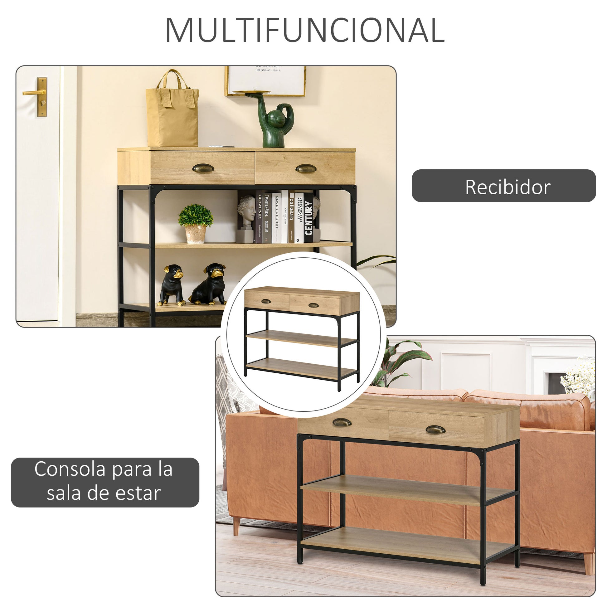 Console Table Entryway Table with 2 Drawers and 2 Storage Shelves Steel Frame Hallway Furniture for Hallway Living Room 100x35x79.2 cm Oak