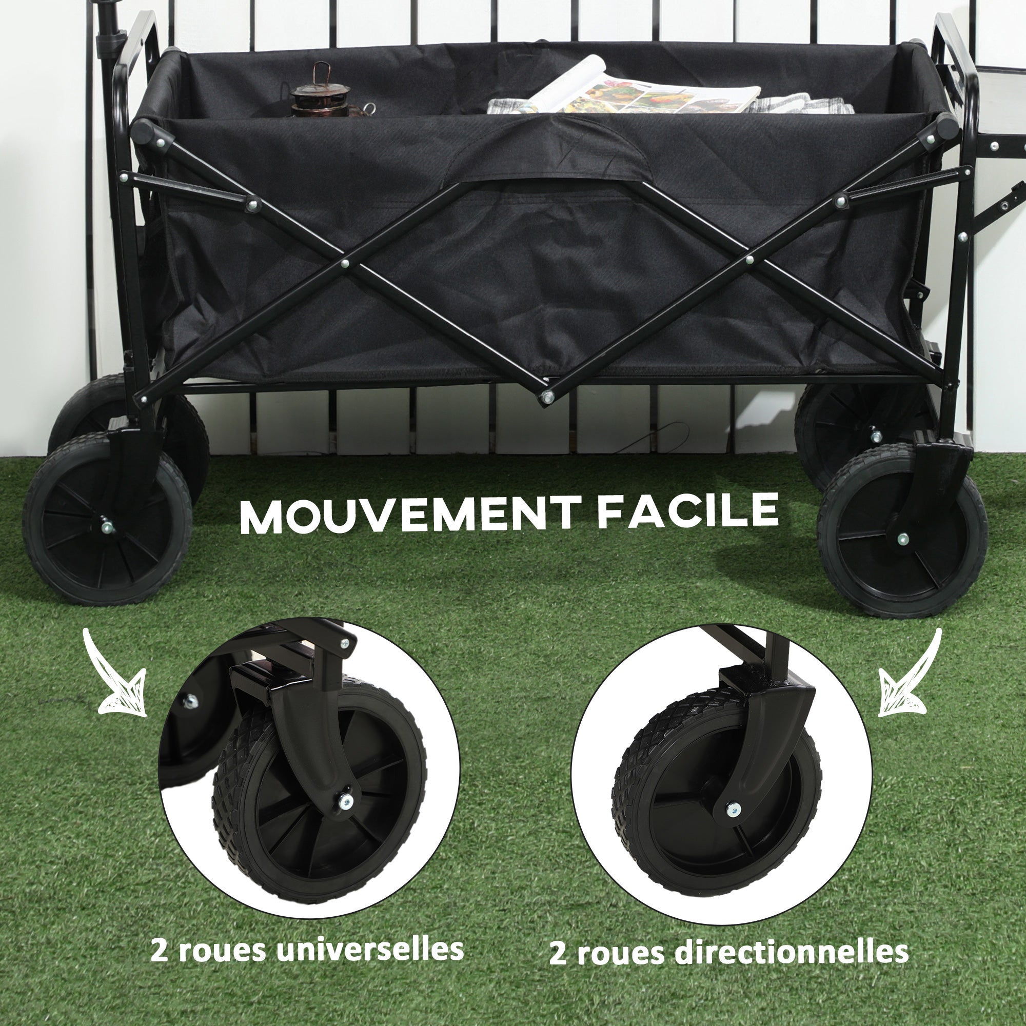 - - CONVENIENT TRANSPORT CART: With its large storage bag, the folding cart is perfect for shopping, the beach, sports, camping, or any activity requiring object transport. With its adjustable handle, it can adapt to different body sizes and road angles.