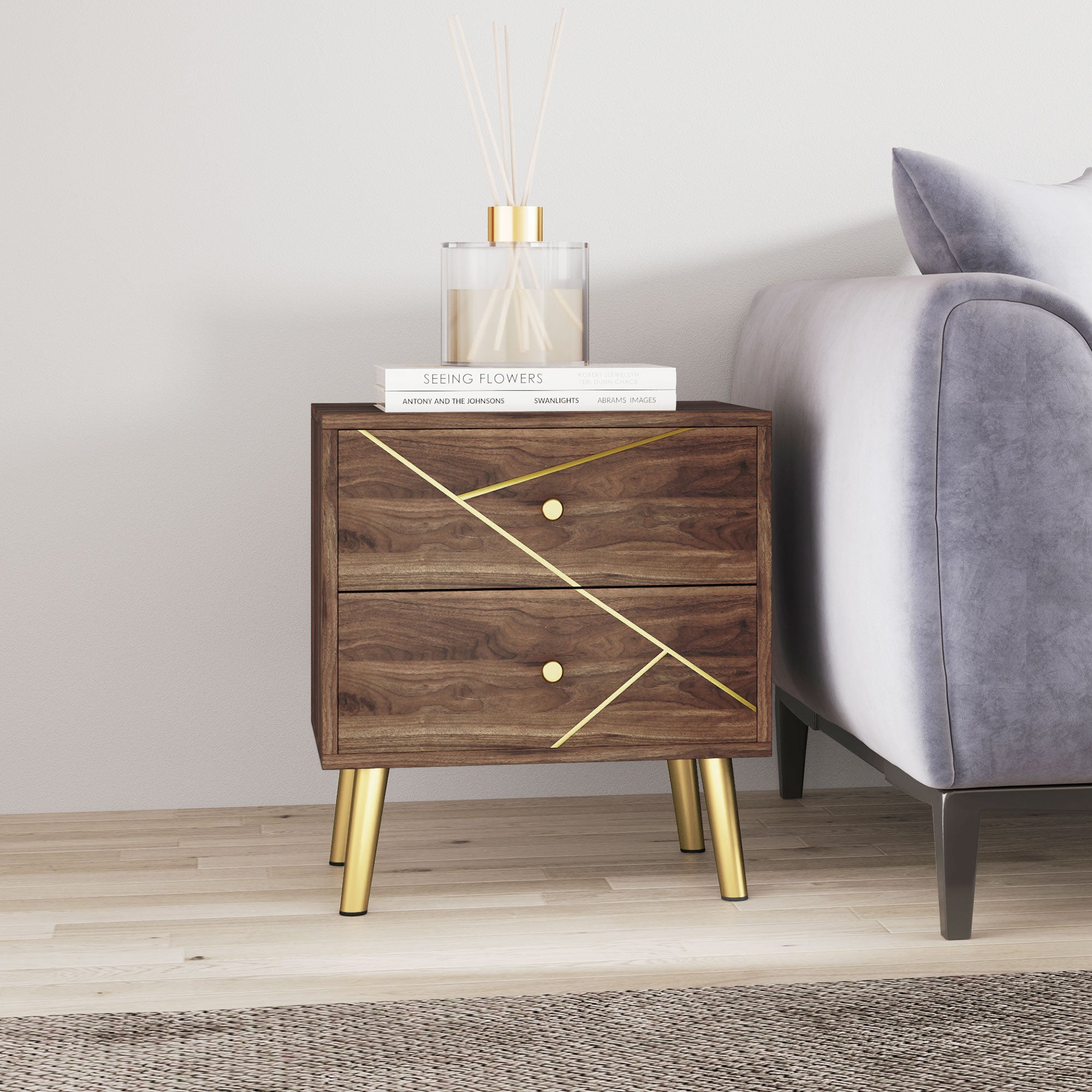 • - MODERN & LUXURIOUS: With refined finishes, this bedside table features golden steel lines on the drawer fronts, elegant golden legs, and wood grain veneer, bringing a certain elegance to your room