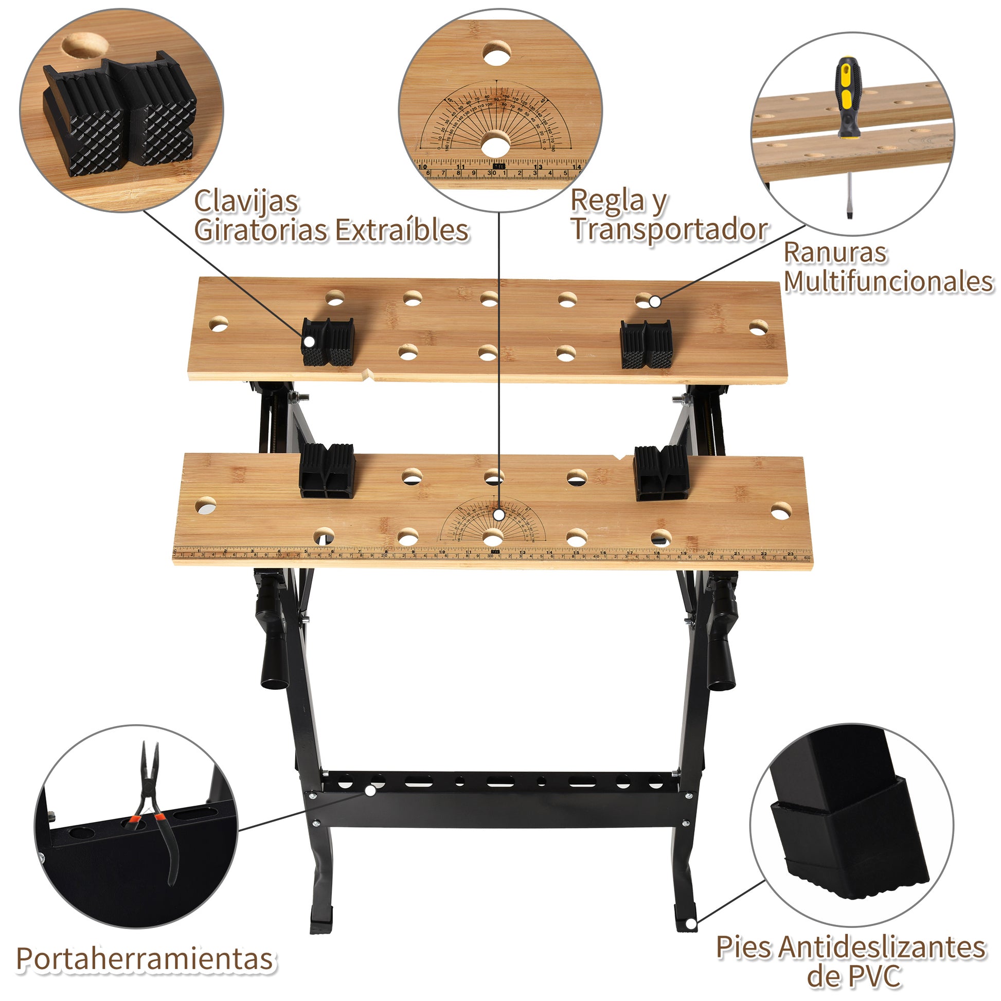 - - STURDY WORKBENCH: With a galvanized steel structure and two bamboo boards, it can support up to 150 kg. Non-slip PVC legs provide stability and prevent floor scratches. It has connecting bars between the legs with multiple slots for tool storage.