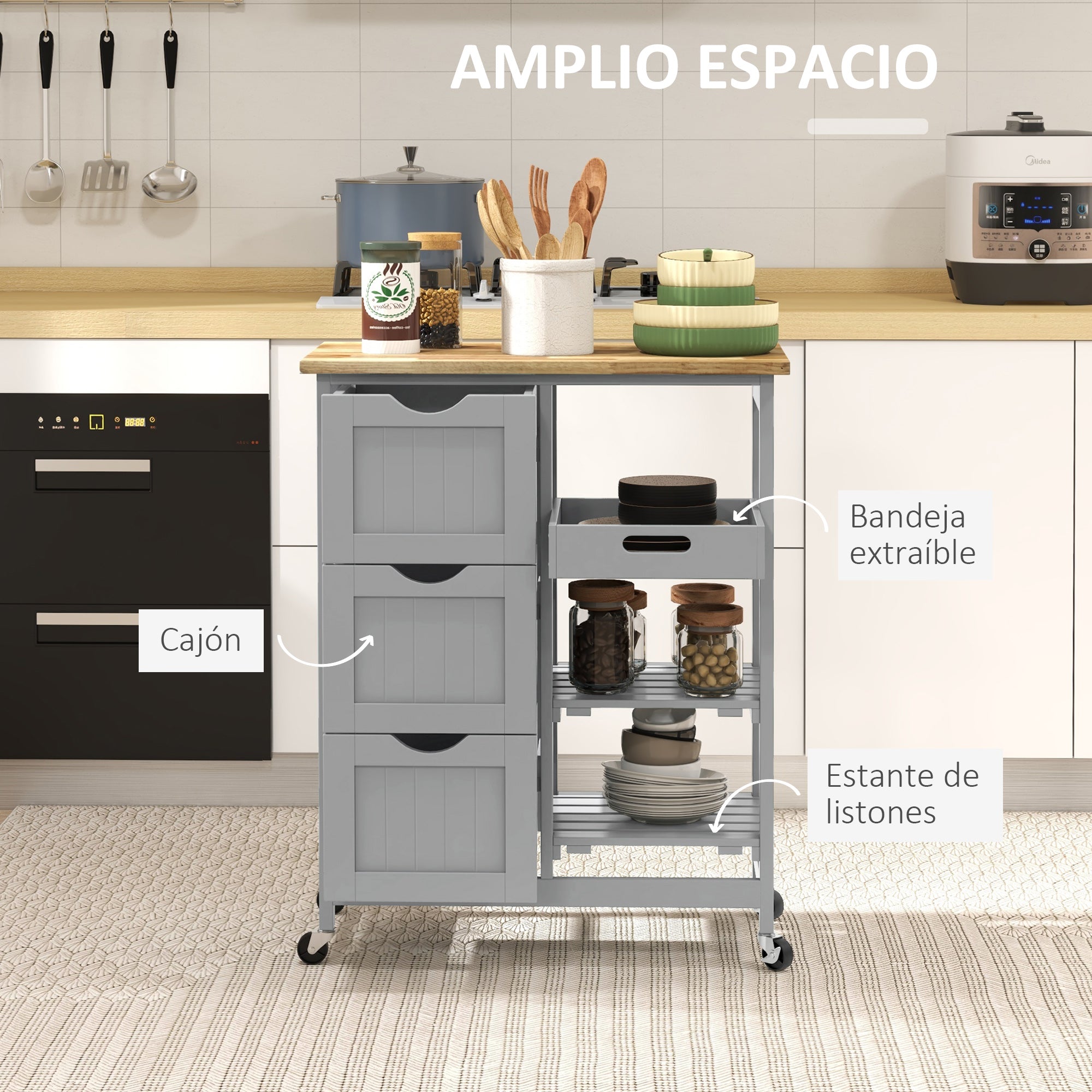 Kitchen Cart Utility Cart with Wheels Wood Top 3 Drawers 2 Open Shelves and Removable Tray for Dining Room Living Room 67x37x85.5 cm Gray