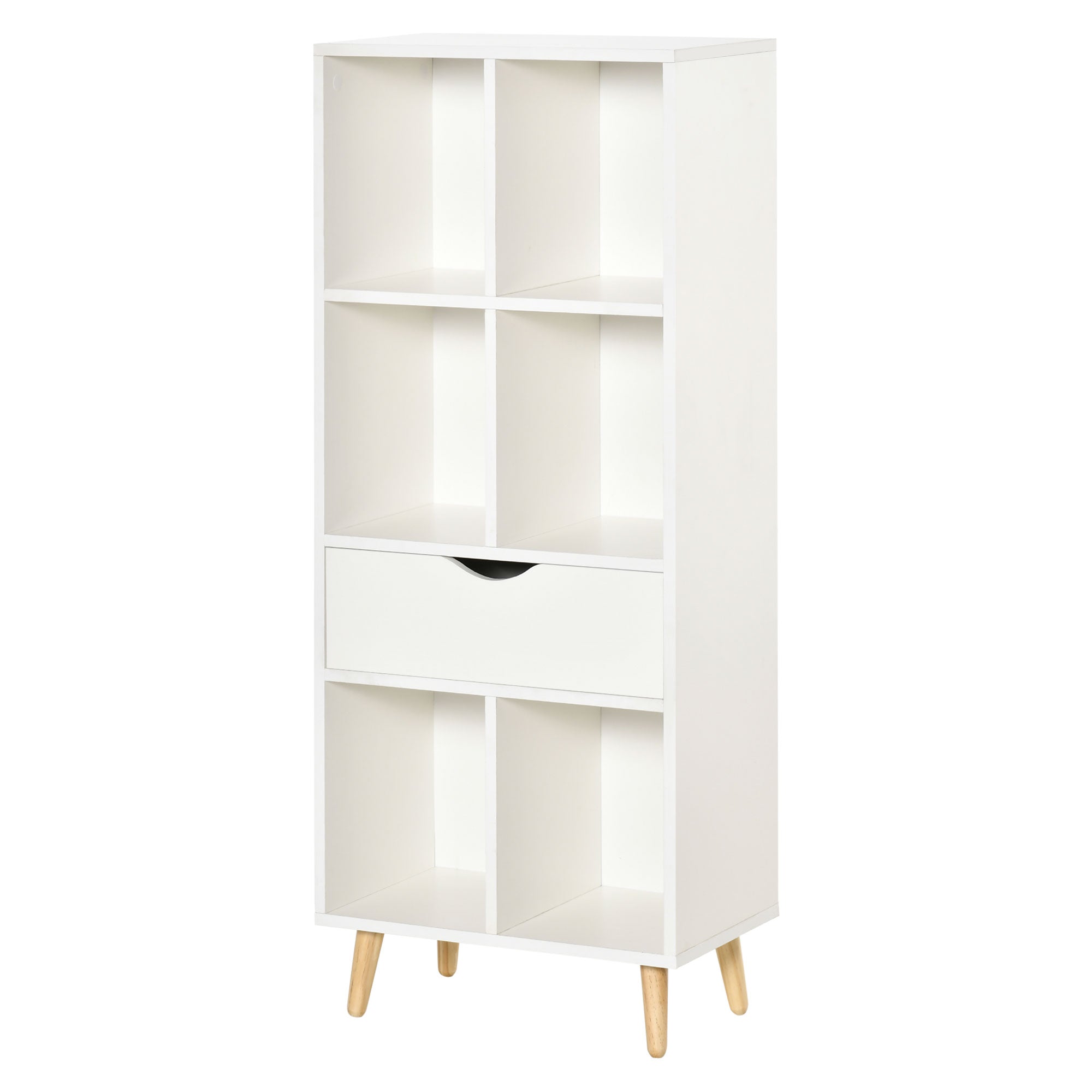 Bookcase Shelf for Books with 1 Drawer and Wooden Legs 6 Open Storage Compartments Plants Files for Living Room Bedroom Office 50x29.5x120 cm White