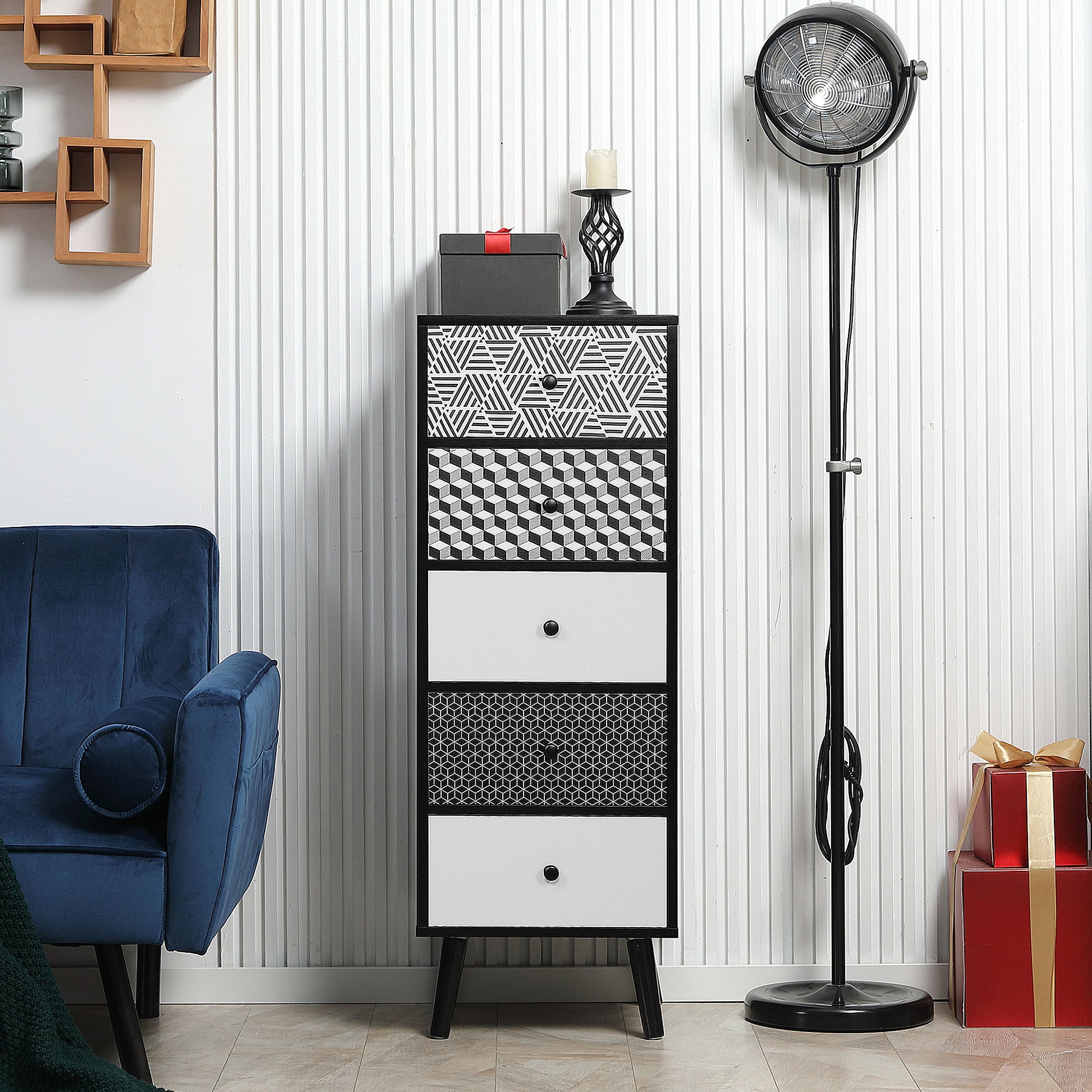 Geometric Pattern 5-Drawer Dresser, Modern Furniture for Bedroom and Entrance, 40x40x111.5cm Black Gray