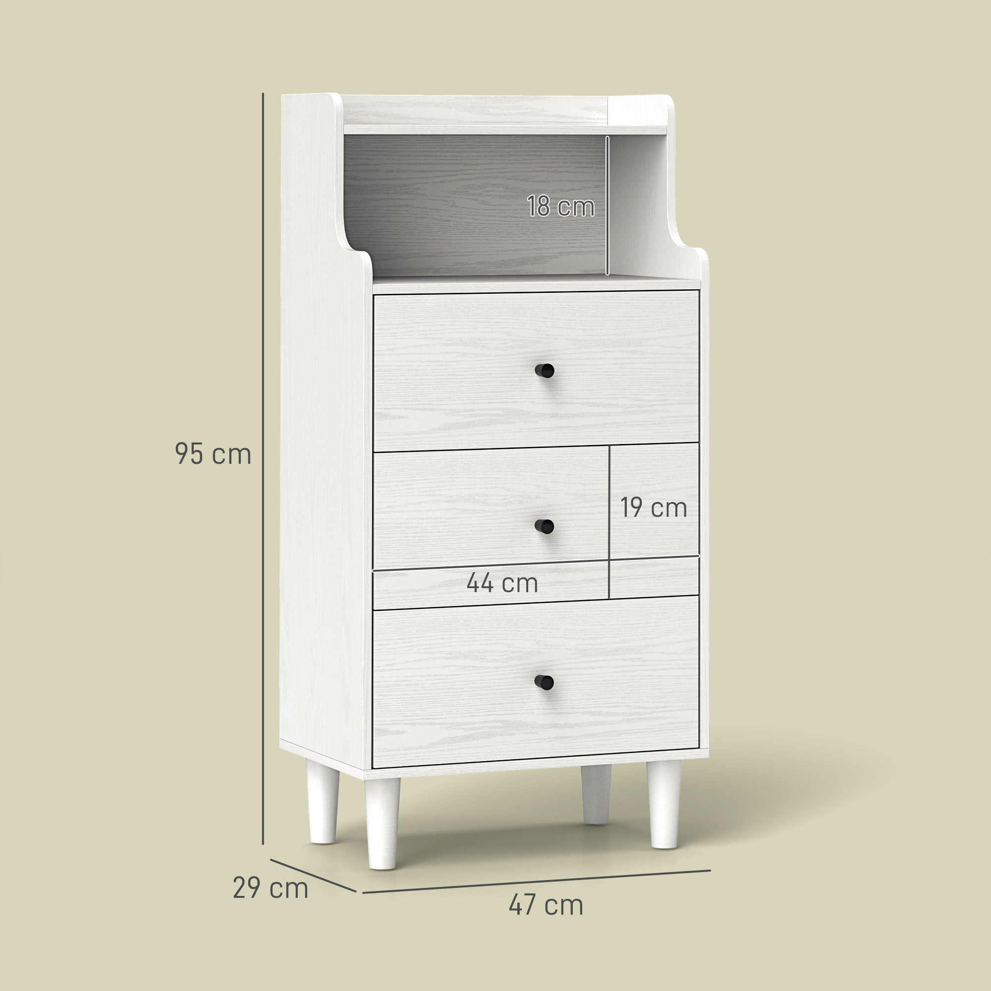 Need extra storage space? This HOMCOM dresser offers the perfect balance between functionality and style. With three drawers for your essentials and two open shelves to display your decorations, this furniture transforms any space. Ideal for bedrooms, living rooms, or entryways, it features a modern design with white melamine panels and black round handles. Additionally, it includes an anti-tip safety system, ensuring greater stability and safety.