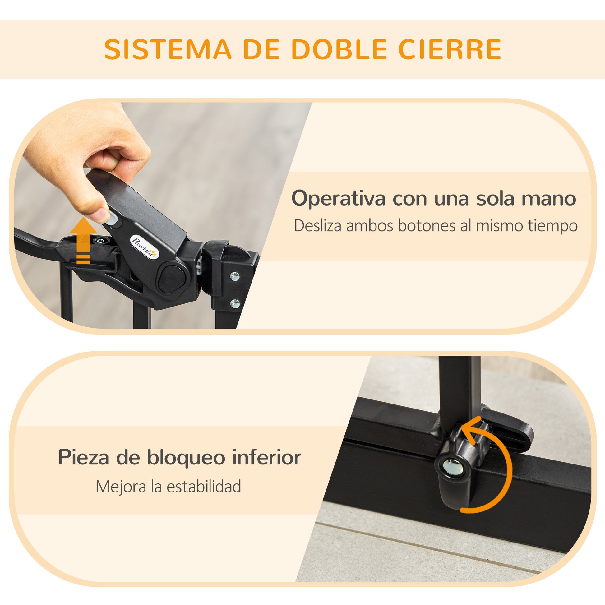- - DOUBLE LOCKING SYSTEM: The door of this dog safety barrier can be opened with one hand by sliding two buttons simultaneously and lifting them. It also has two rotating latches at the bottom, so the door can be set to open in any direction or only in one