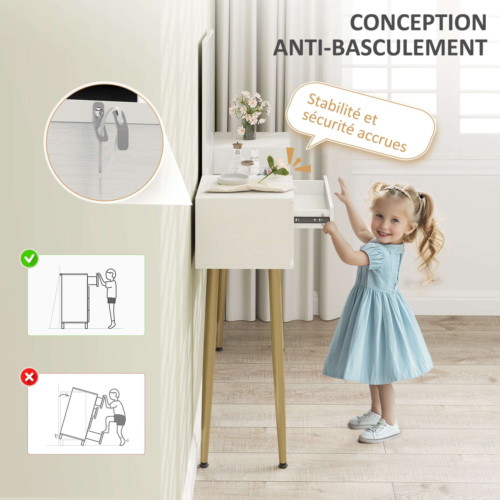 - - SAFETY FIRST: Designed to ensure stability and practicality, this dressing table with mirror is equipped with an anti-tip kit and smooth two-section drawer slides. The desk and stool also have adjustable feet for perfect stability, even on uneven floors.
