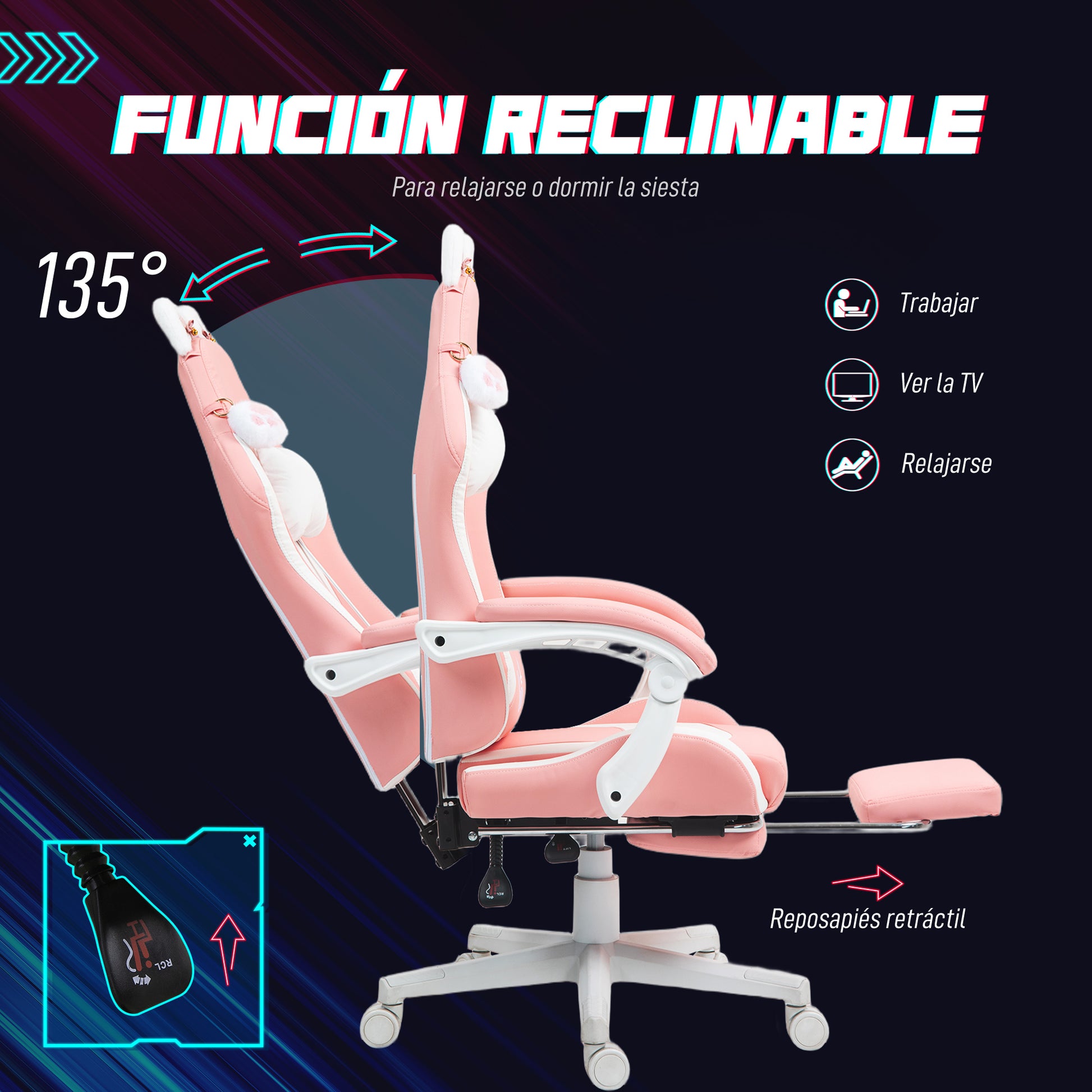 Gaming Chair with Cat Ears Reclining Gamer Chair with Adjustable Height Retractable Footrest Lumbar Support and Detachable Headrest Office Study Chair Pink