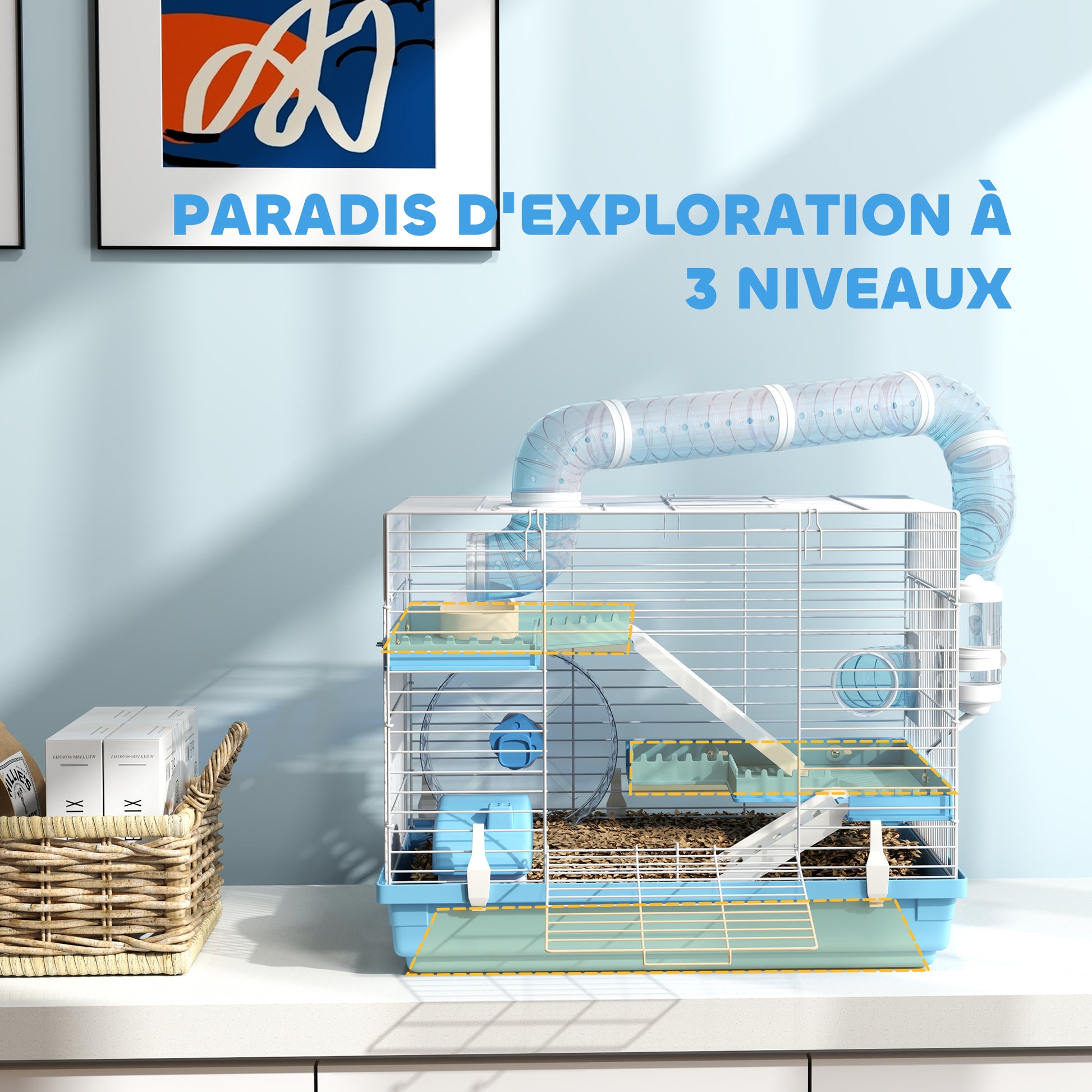 Discover the PawHut hamster cage, ideal for dwarf hamsters. With three levels, exploring tubes, water bottle, food bowl, hut, and wheel. Removable metal cage for easy cleaning. A fun and portable retreat for your little friend.