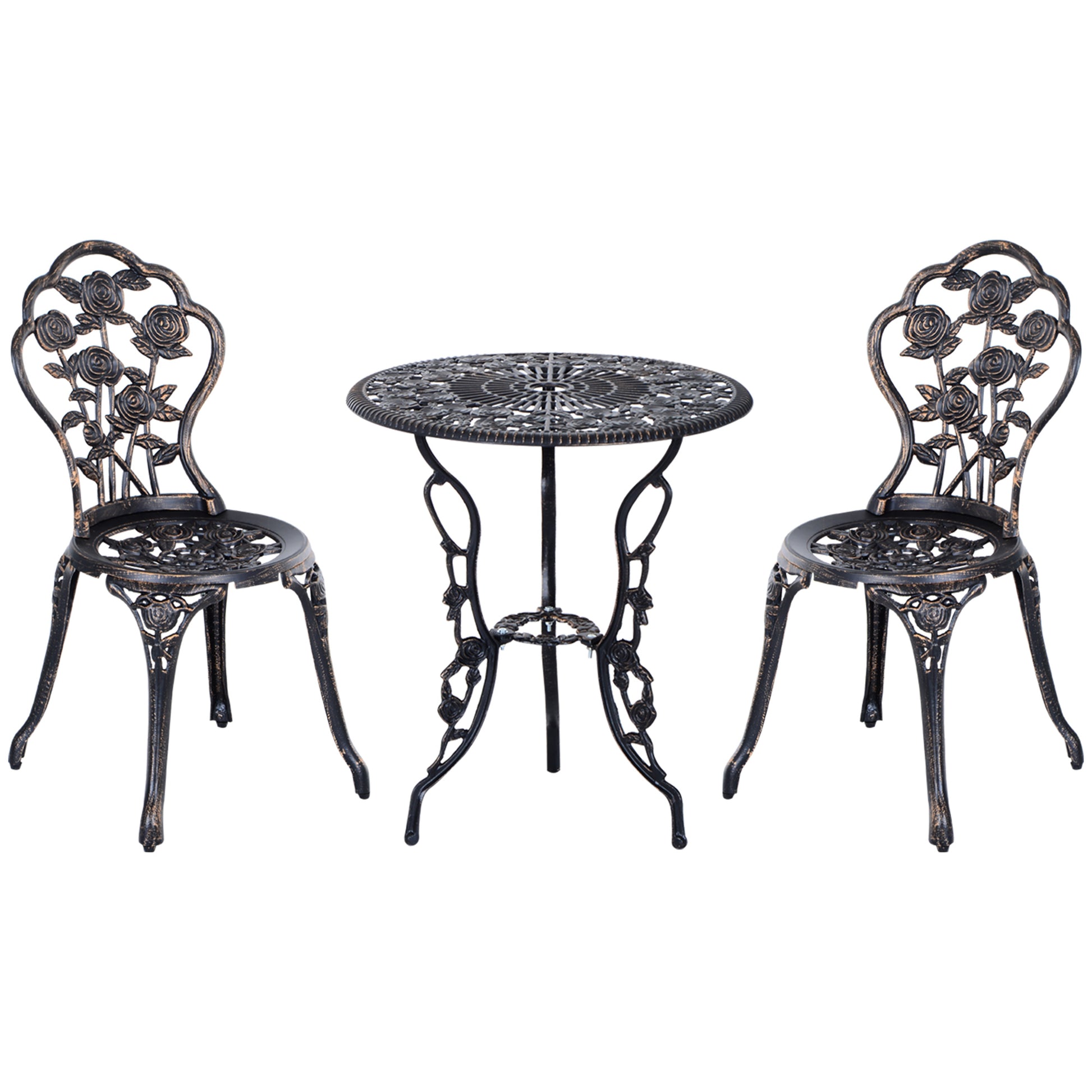 This decorative garden furniture set in a nostalgic vintage design fits perfectly in your garden, on your terrace, or in your home. The vibrant cast rose pattern on the table and chairs makes the bistro set a charming focal point on your terrace. The table and chairs are made of a durable aluminum cast frame with sturdy cast iron feet in bronze look. Light and extremely robust, this unique balcony furniture is ideal for permanent outdoor use.