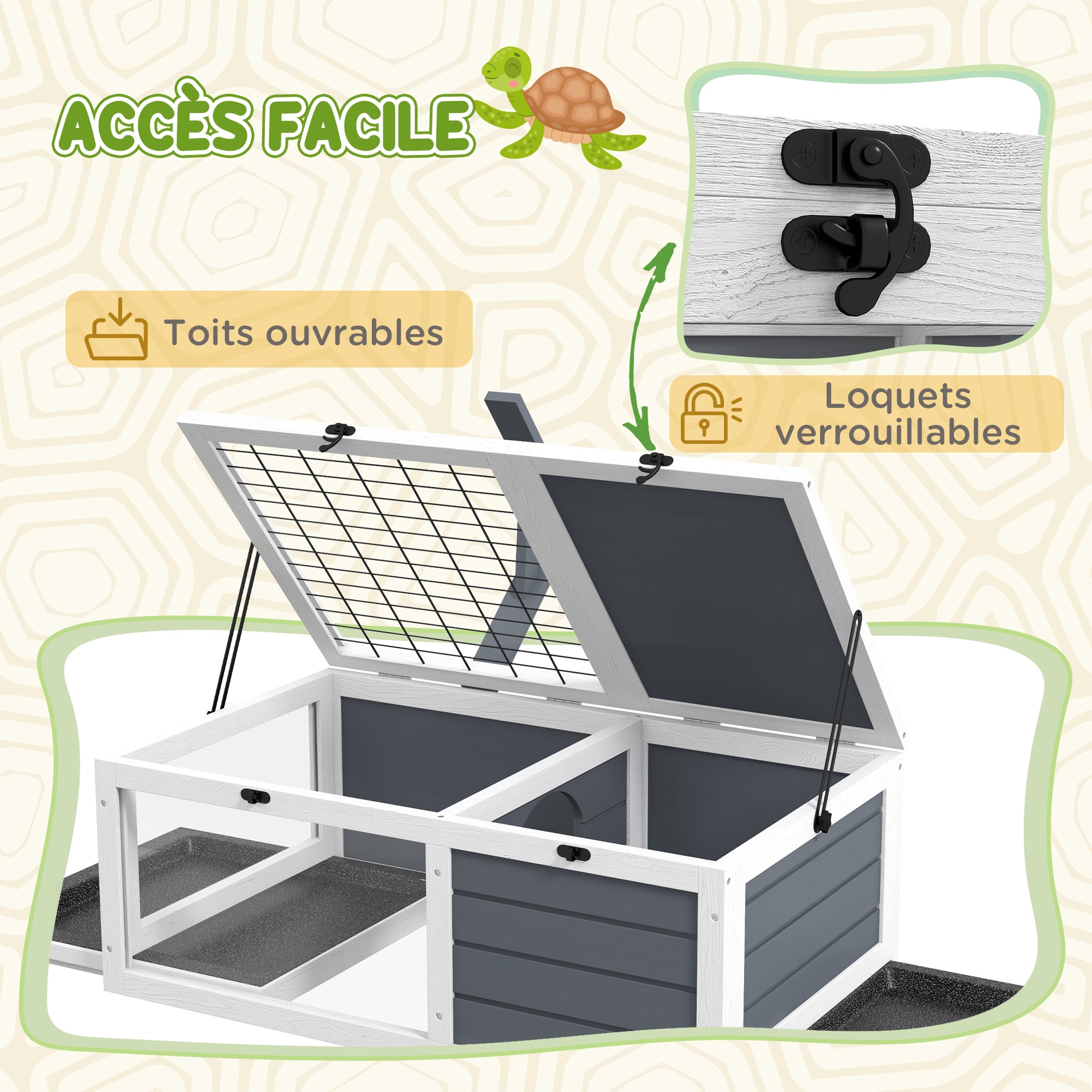 - - QUALITY MATERIALS: Tortoise house made with quality materials, pre-oiled fir wood, painted and steel mesh - Mesh cage to allow your pet to benefit from satisfactory ventilation and to facilitate their monitoring - 2 sliding trays and openings make cage maintenance easy