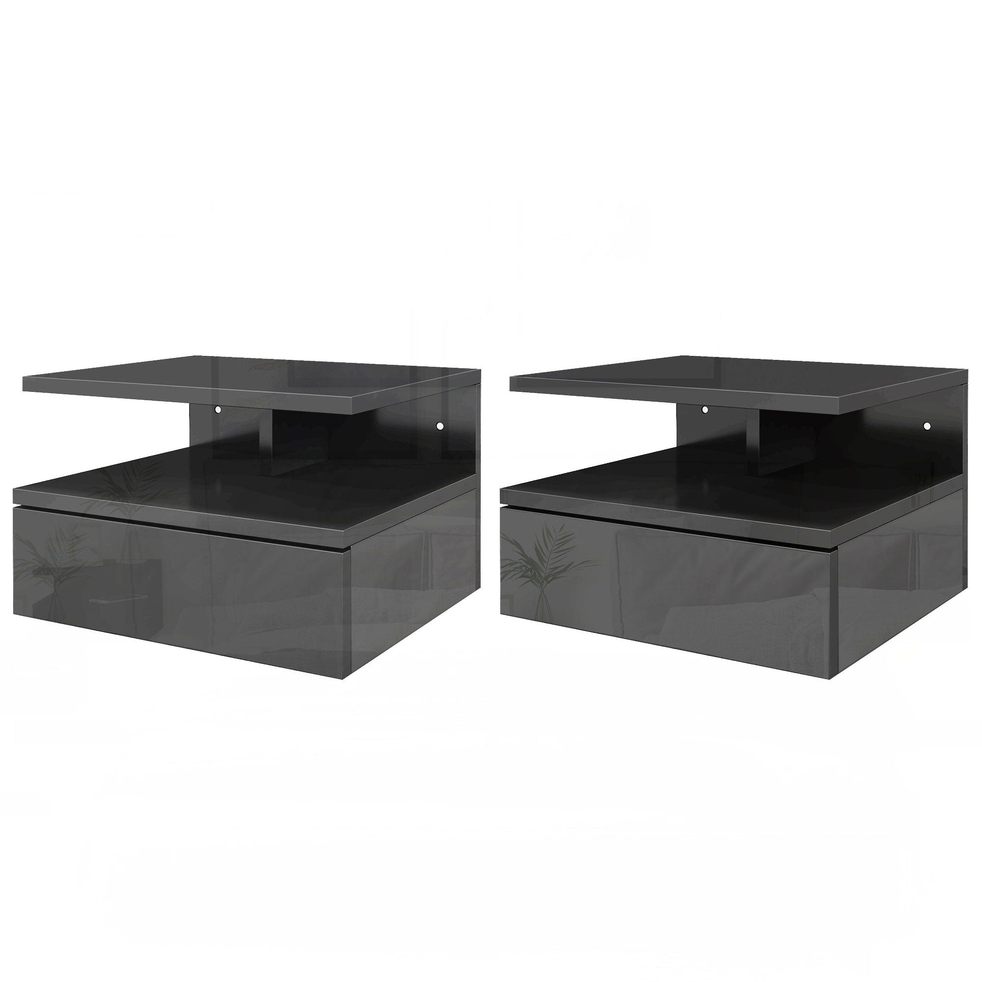 Set of 2 Wall-Mounted Bedside Tables, Modern Bedroom Bedside Tables, with Drawer and Upper Shelf in Wood, 35x32x22.5cm, Glossy Black