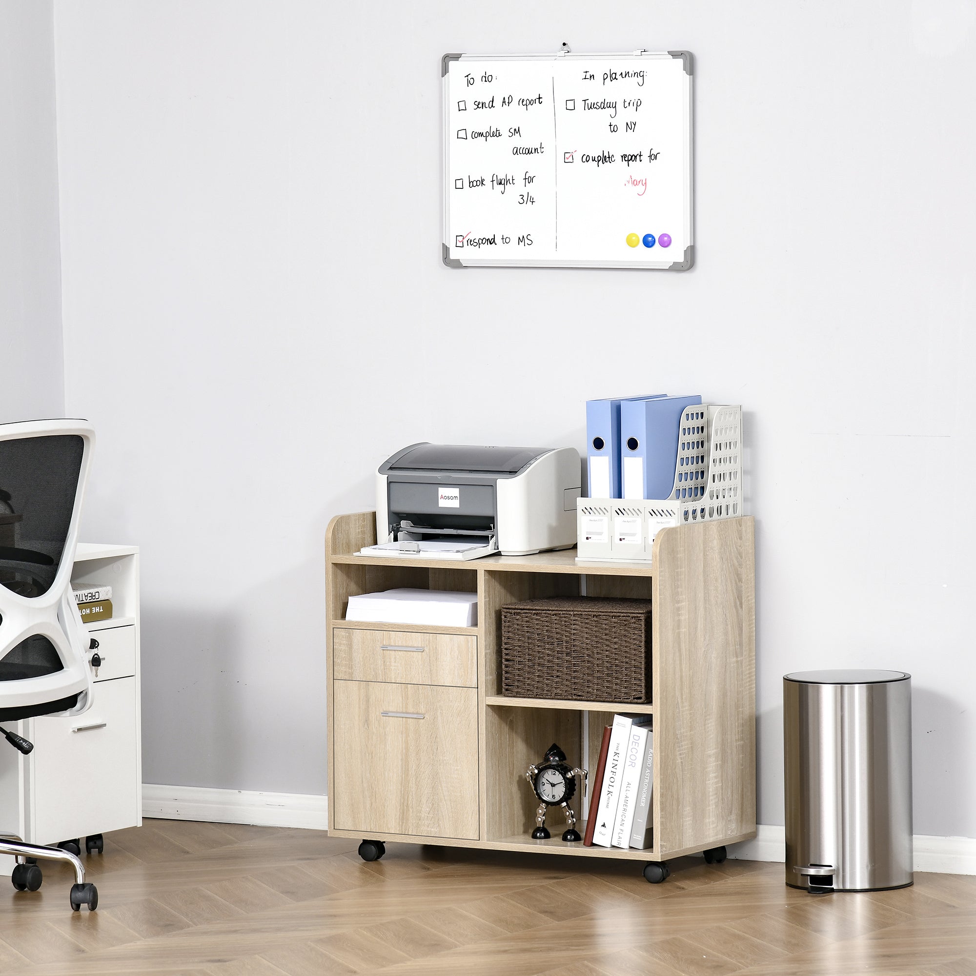 Office Printer Stand Multifunctional Office Cart with 3 Compartments 2 Drawers for Files Adjustable Shelf Wheels with 2 Brakes 80x40x72 cm Oak