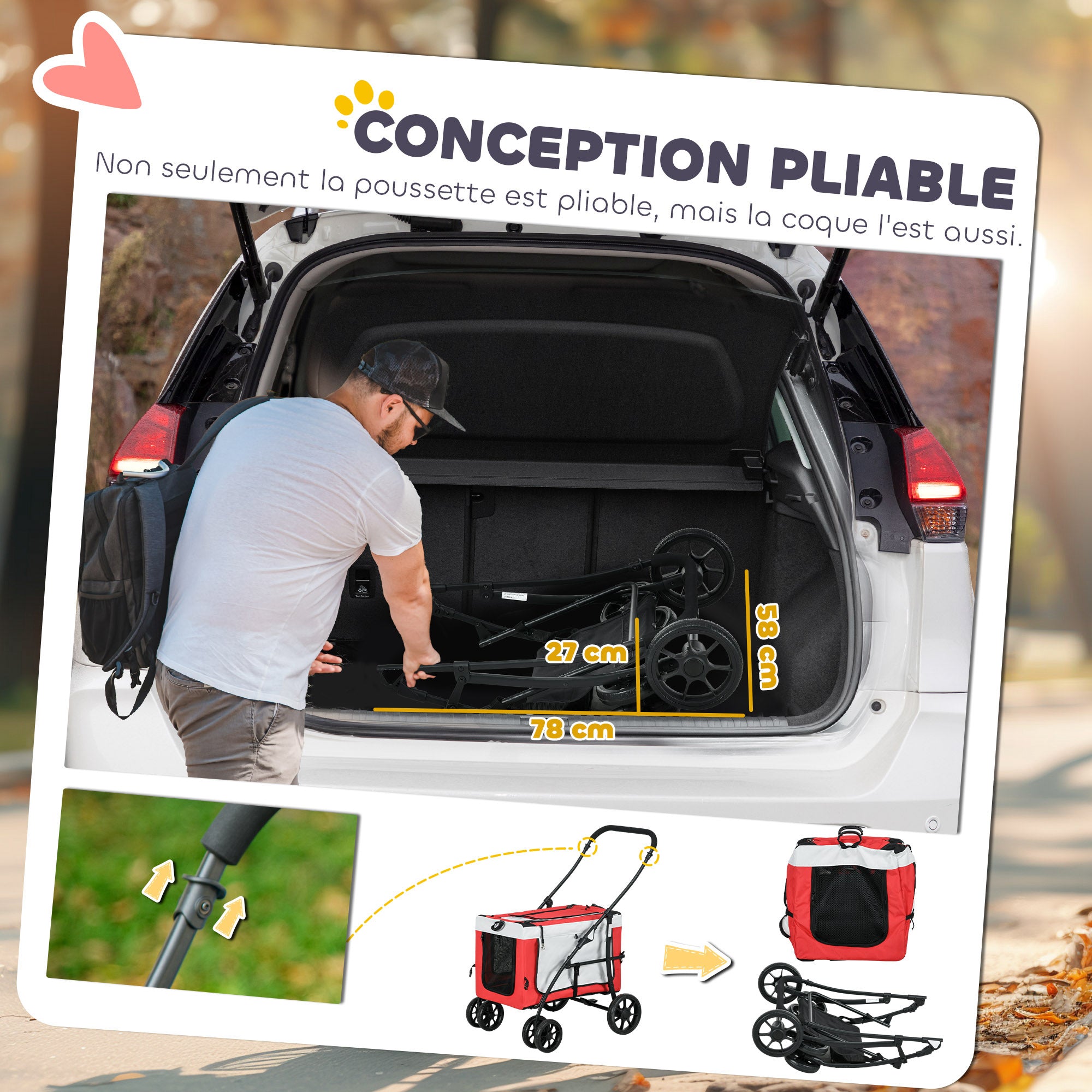 This superb stroller is designed for your pet to make your walks, runs, etc., easier. Easy to fold, sturdy, and practical... this stroller will quickly become indispensable, especially if your dog is sick or elderly. It folds in one click and is easy to transport. The bassinet is removable for shoulder transport if needed.