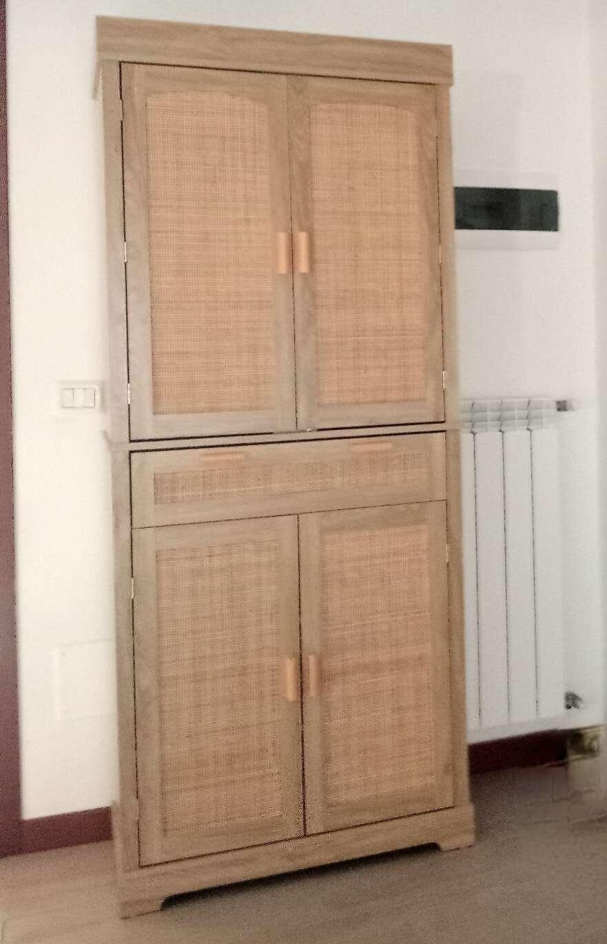 - Kitchen cabinet with oak finish with woven rattan elements for a boho look;