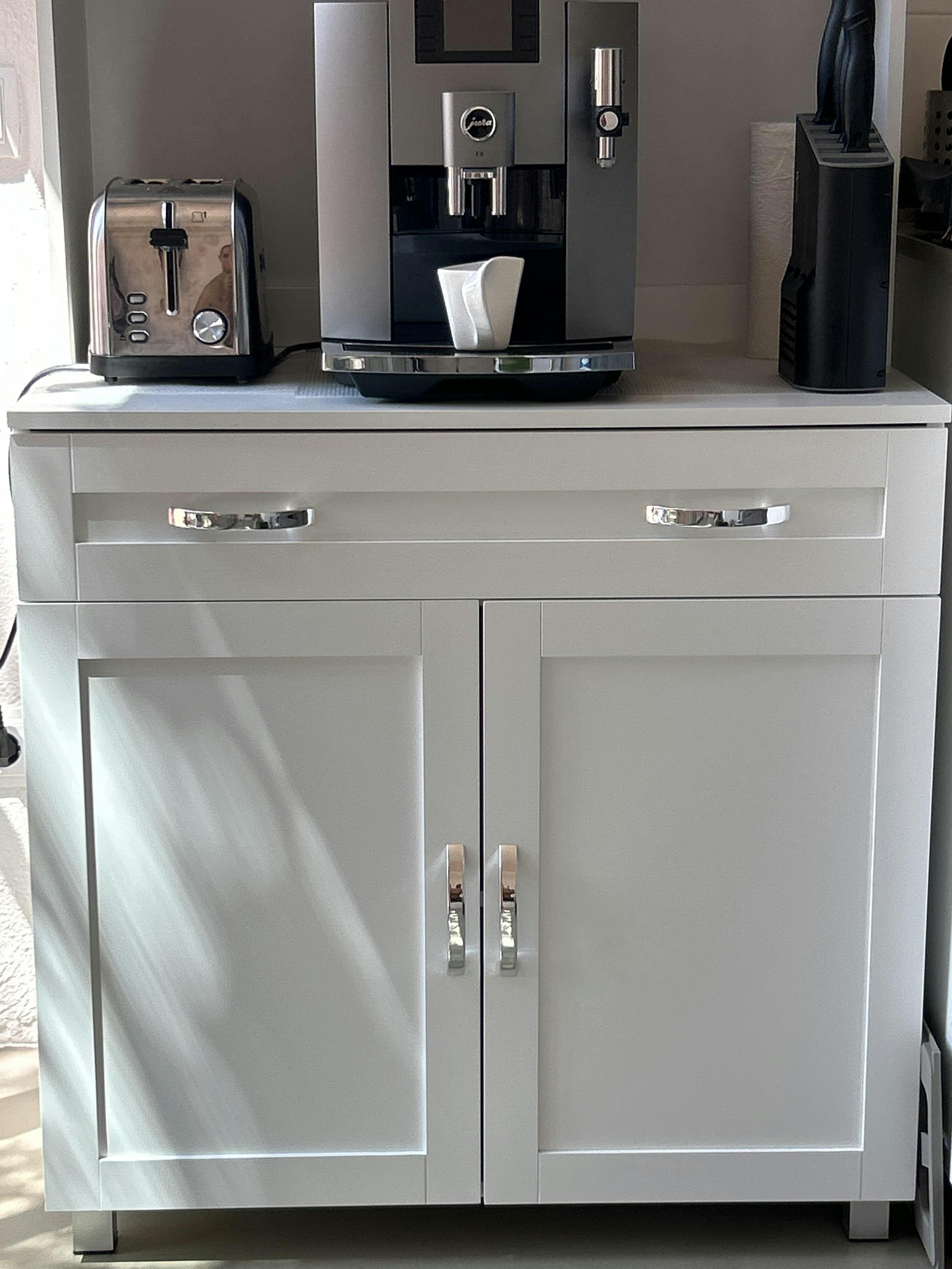 - - AMPLE STORAGE: Features 2 double-door cabinets and a removable drawer for kitchen utensils and supplies. Both cabinets are equipped with adjustable interior shelves to accommodate items of different sizes. And the large countertop is perfect for placing a microwave or coffee maker.