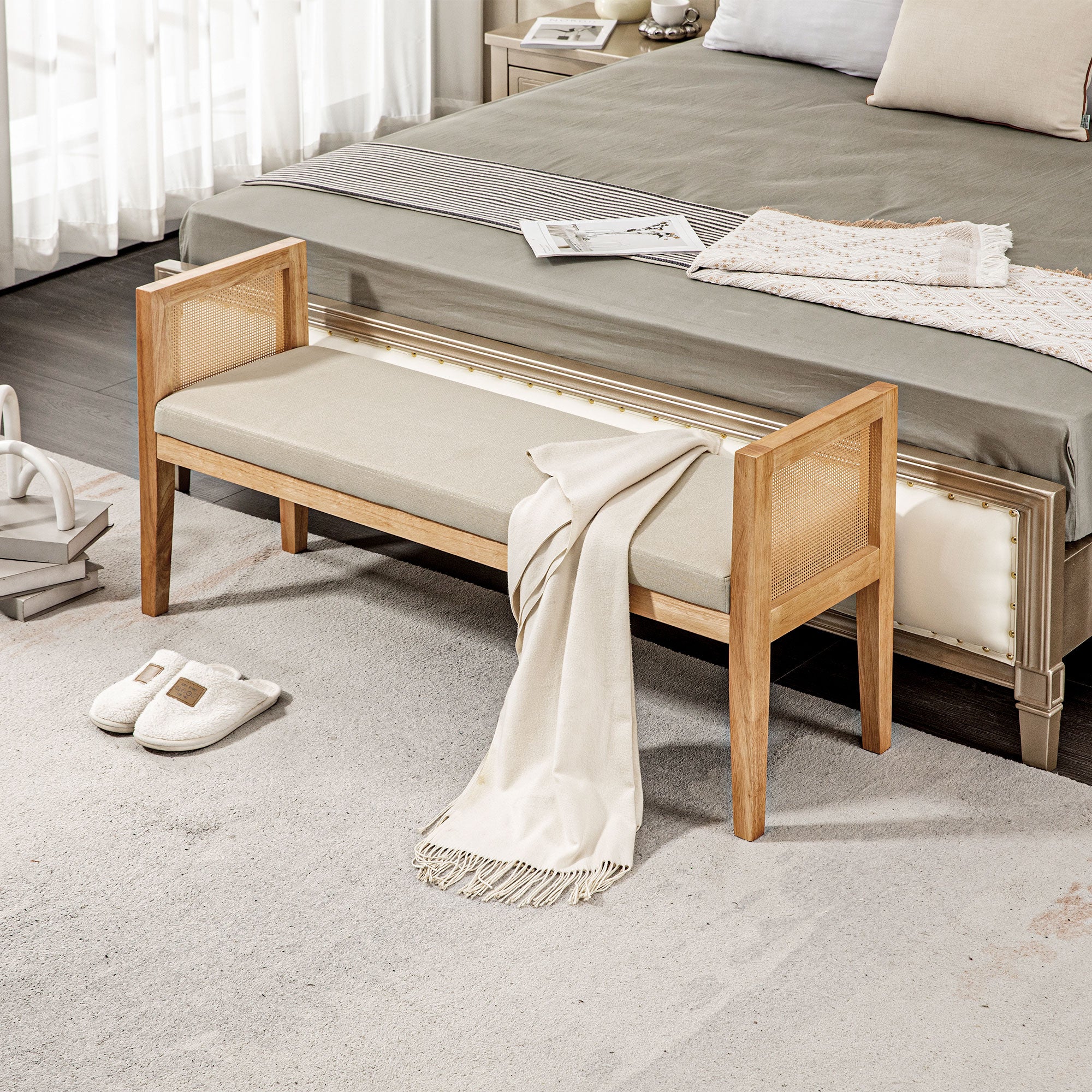 End of Bed Bench, Entryway Bench, Rattan Armrests and Solid Wood Frame, Linen-Effect Upholstered Seat, End of Bed for Bedroom, Living Room, Modern Design, Cream