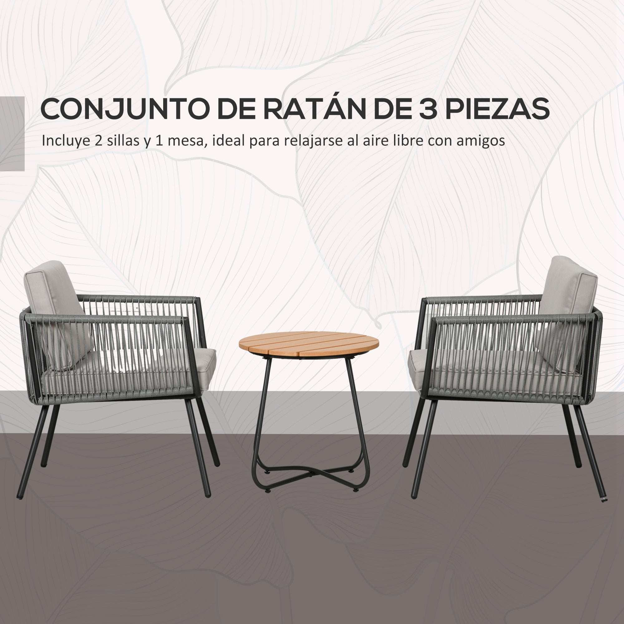 Synthetic Rattan Garden Furniture Set 3 Pieces Table and 2 Rattan Chairs with Removable Padded Cushions for Balcony Terrace Patio Gray