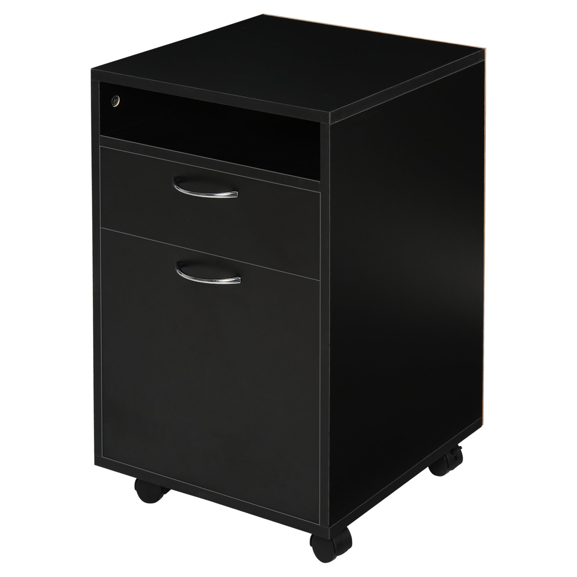 This HOMCOM filing cabinet is perfect for keeping your office organized. Featuring an open shelf, a drawer, and a cabinet, it provides space for documents and items. Its compact design and 4 swivel wheels (2 with brakes) allow for easy movement and placement under your desk. Made of durable wood melamine, it is ideal for extended use, adding functionality and a modern touch to your workspace.