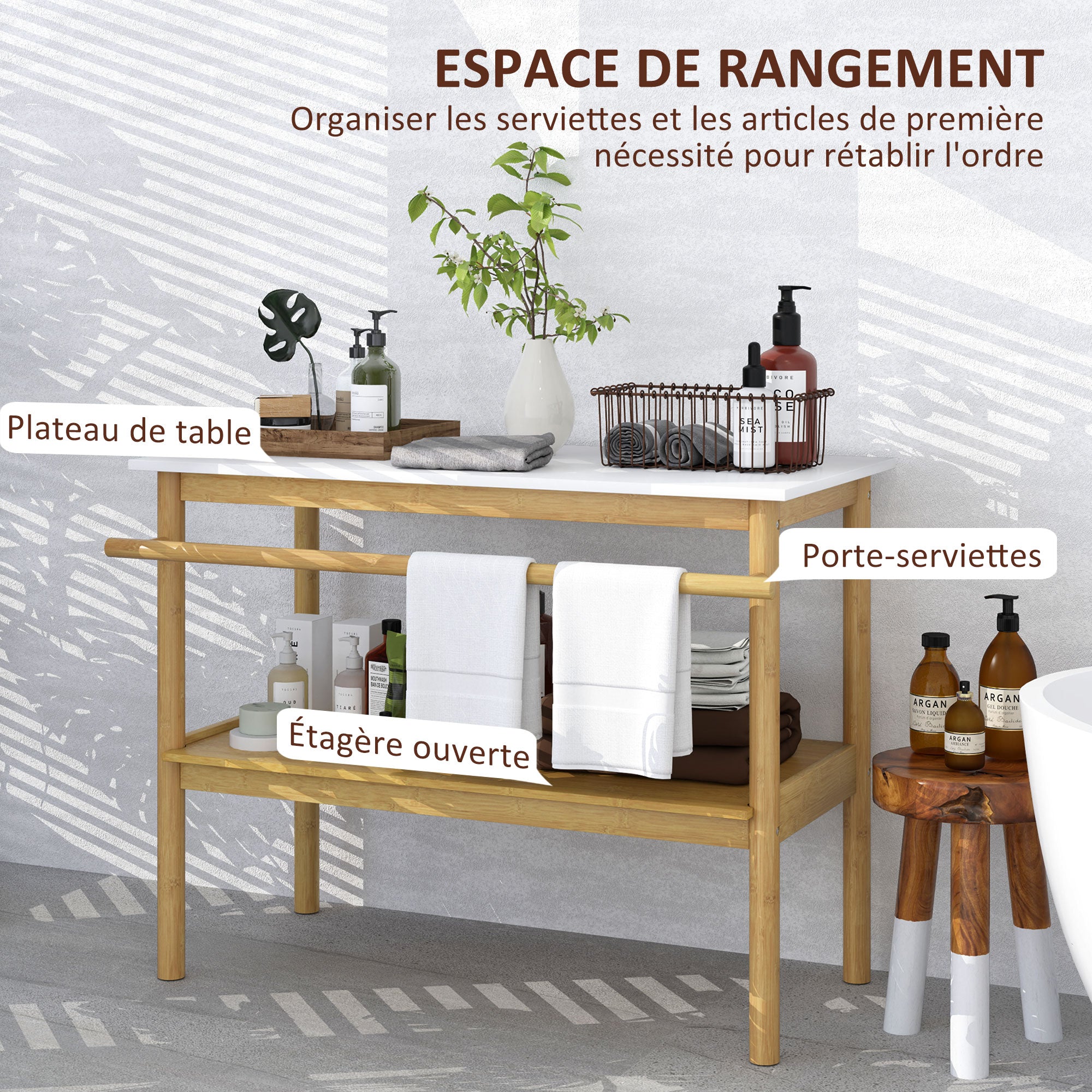 Bathroom shelf storage, bamboo bathroom furniture with 2 tiers with towel bar, open shelf, dim. 100W x 48D x 75H cm, natural and white