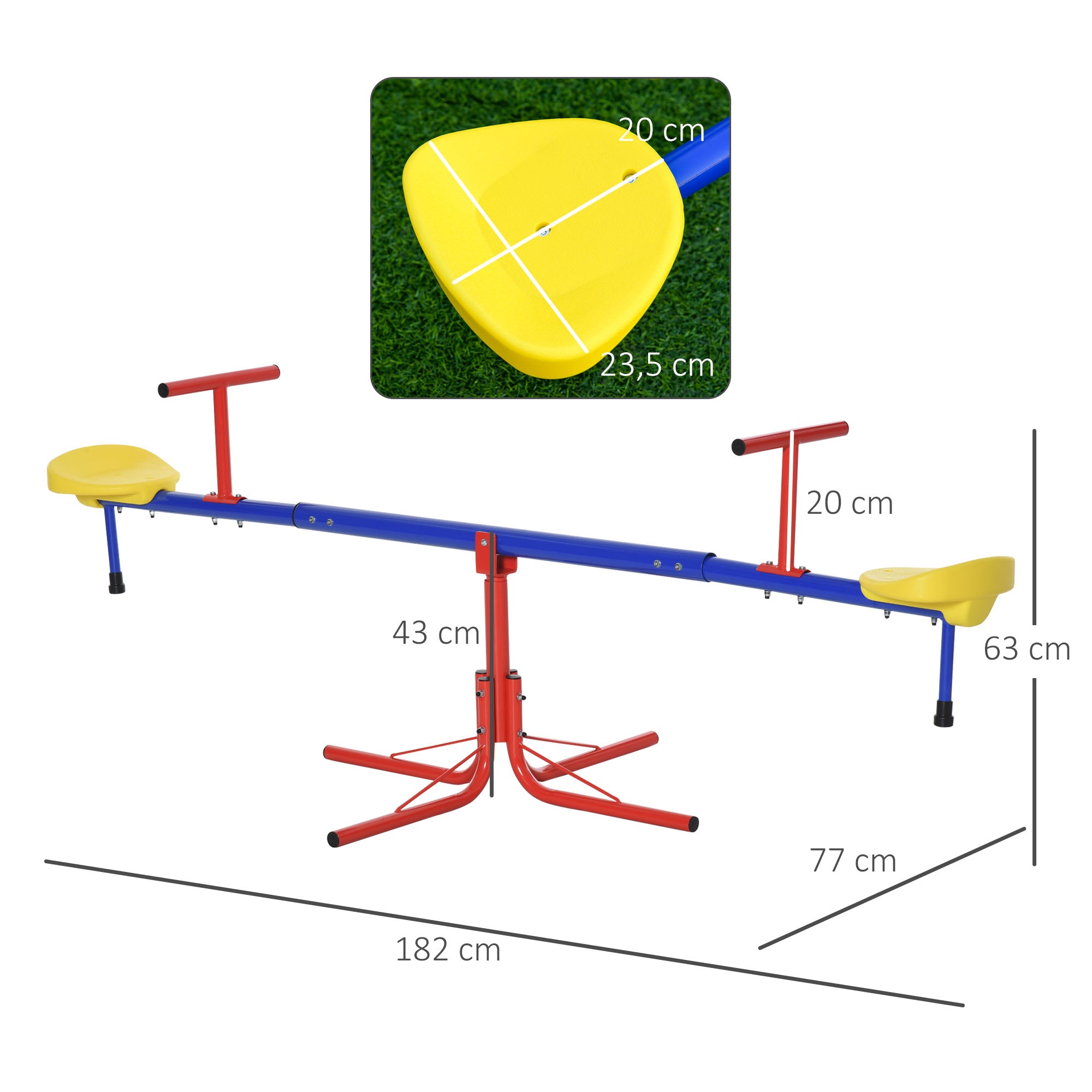 • - QUADRANT BASE: The wide base of this seesaw is composed of 4 rods that ensure the stability and safety of the seesaw and can support up to 80 kilograms, 40 kg on each saddle