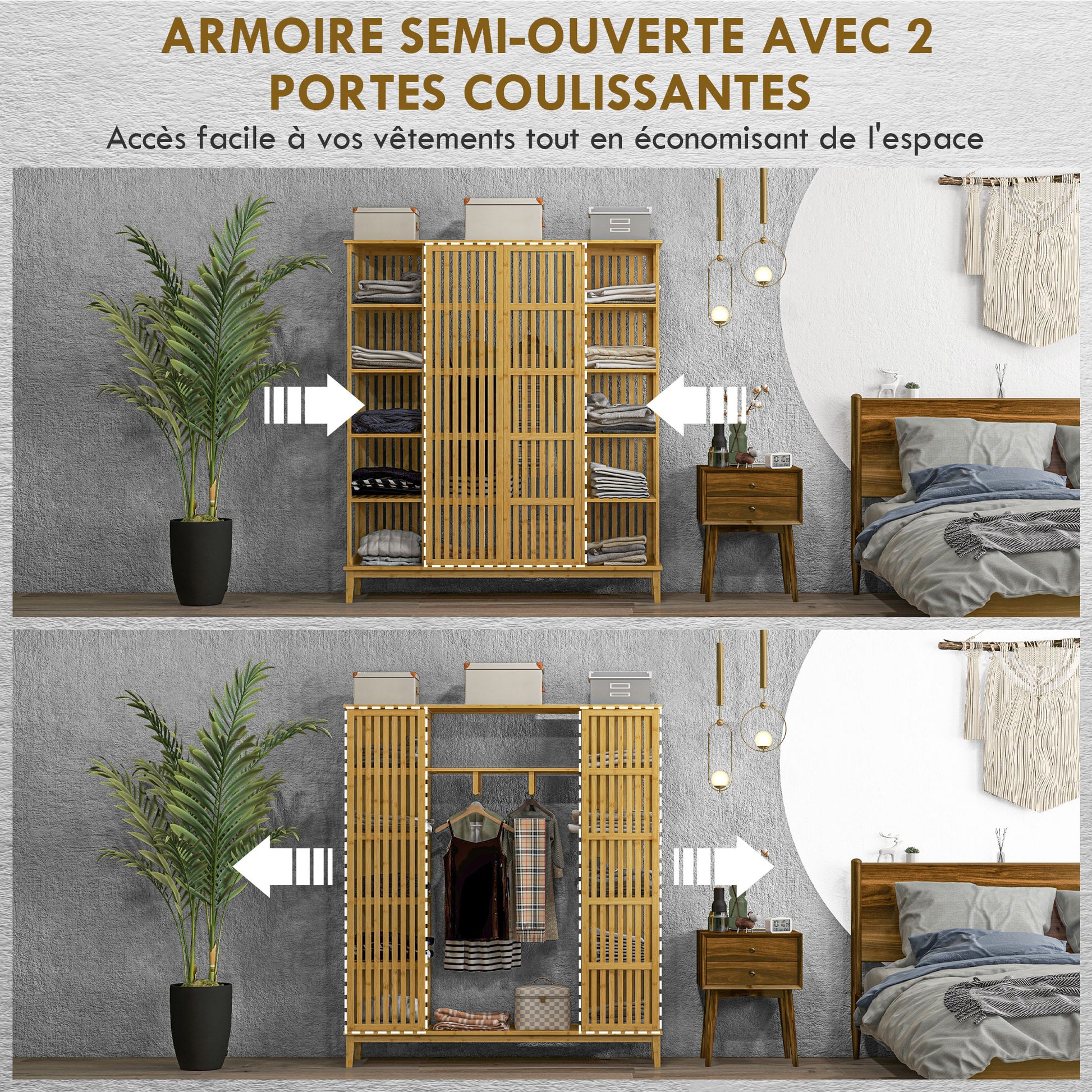 Bamboo Wardrobe Clothing Storage with 2 Sliding Doors, Open Shelves, and Rod for Bedroom, 145 x 35 x 165cm, Natural Wood Finish