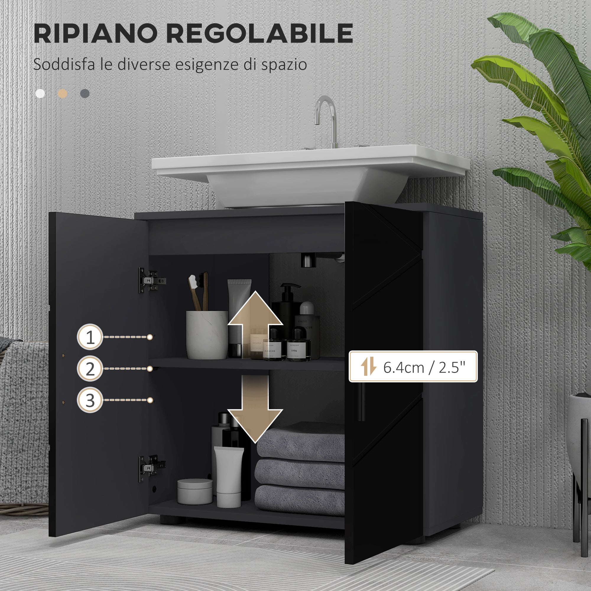 - - ADAPTS TO YOUR NEEDS: The internal shelf of the bathroom under sink cabinet can be adjusted in height at 3 levels, to suit all your space needs. The two doors help to keep everything dust-free and discreetly stored