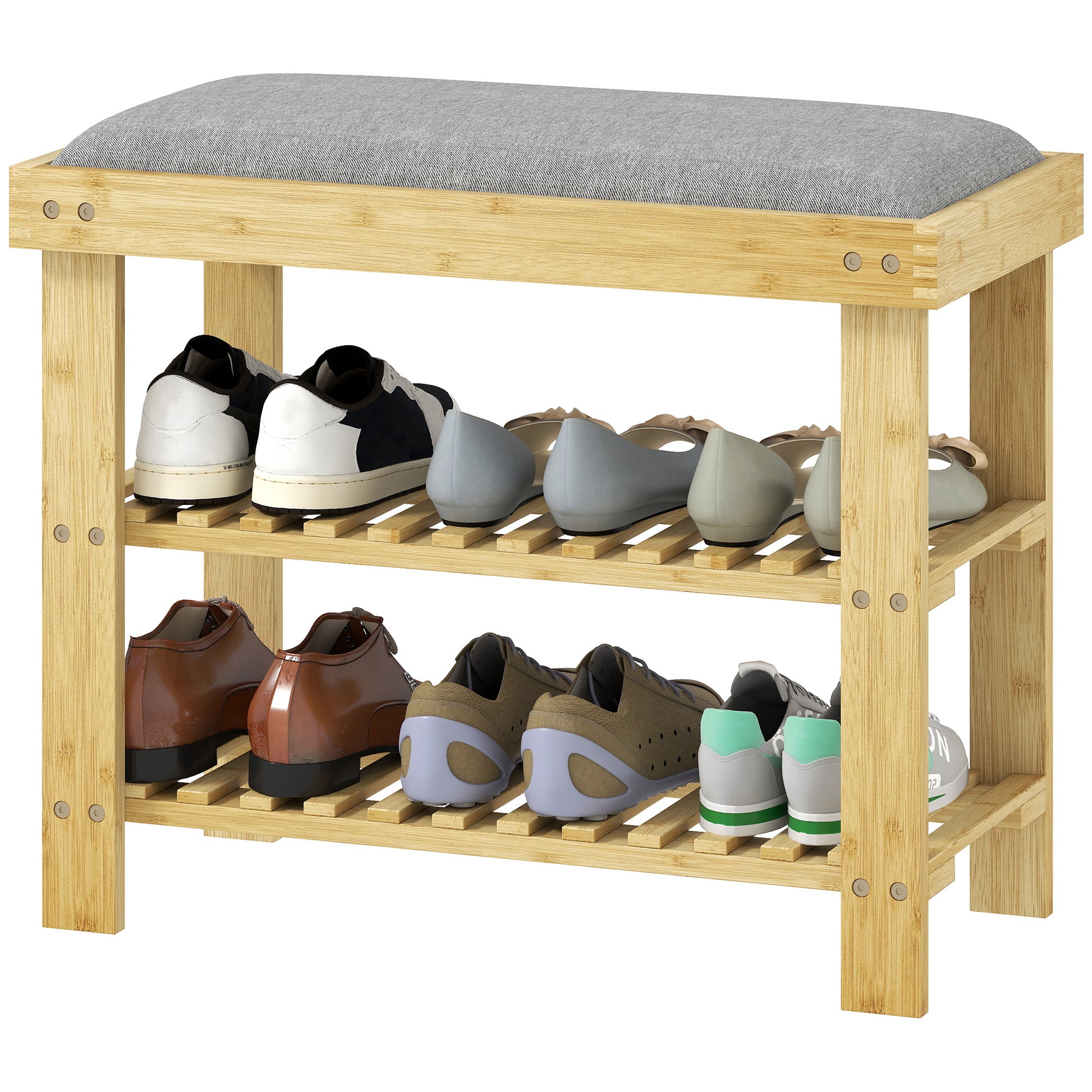 HOMCOM Bambusest Jalatsipink Pehme Istmega, 2 Riiulit 6 Paarile Jalatsile, 60x29x49 cm, Naturaalne ja Hall