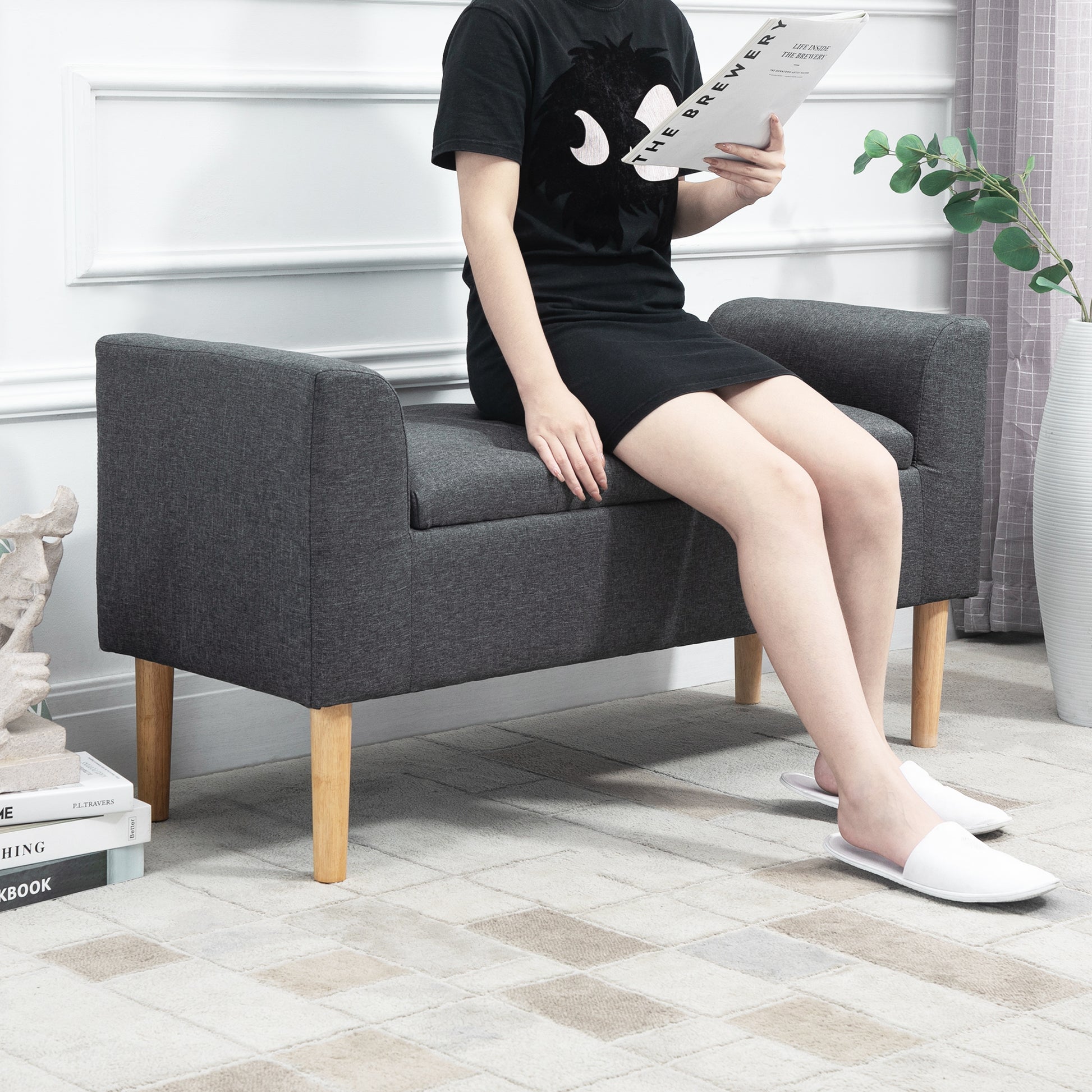 HOMCOM Loodusliku Riidega Lõhestatud Hoiuõrk Tool Käetugedega, Hoiutool Magamistuppa, Eesruumi, Elutuppa, Kanna 130 Kg, Dim. 116 x 44 x 58 cm (Tume Hall)