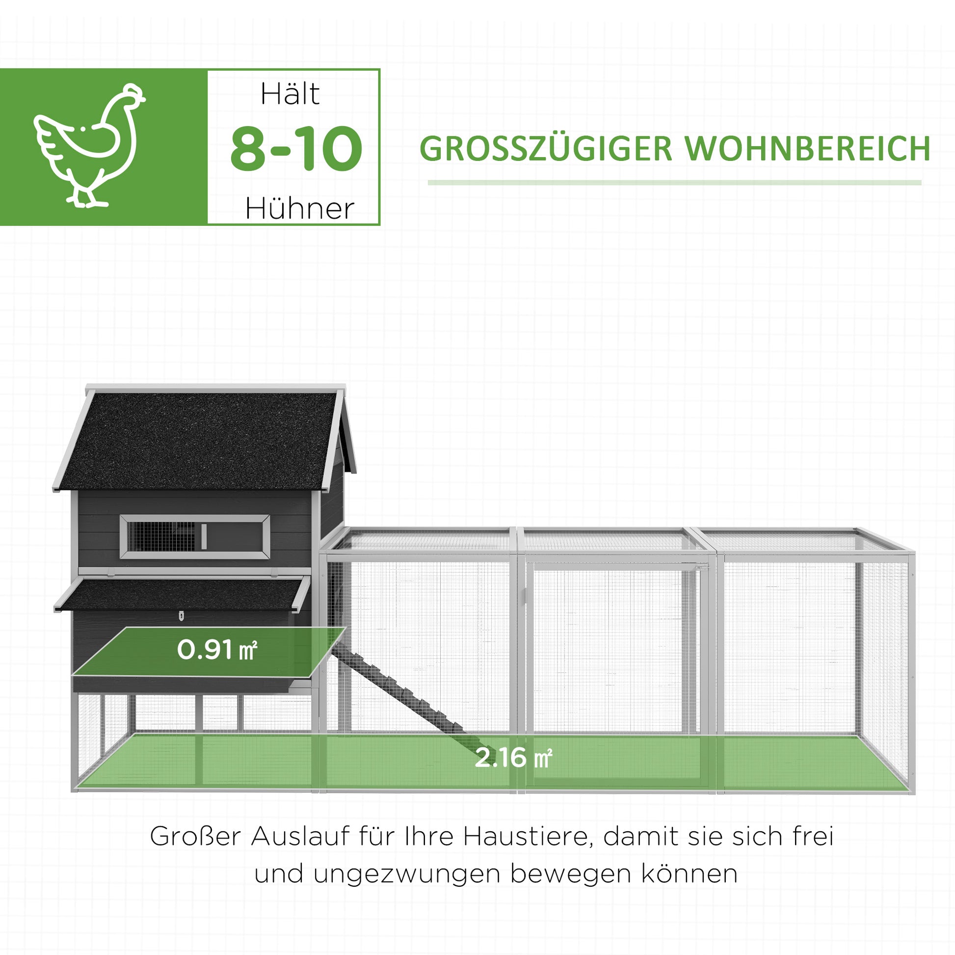- - Avatud disain: Sisaldab kõrgendatud kana puuri koos kahe kolmekordse pesakastiga ja avara külgnevaga aedikuga. See avar kana aed mahutab sõltuvalt nende suurusest ja tõust 8 kuni 10 kana.