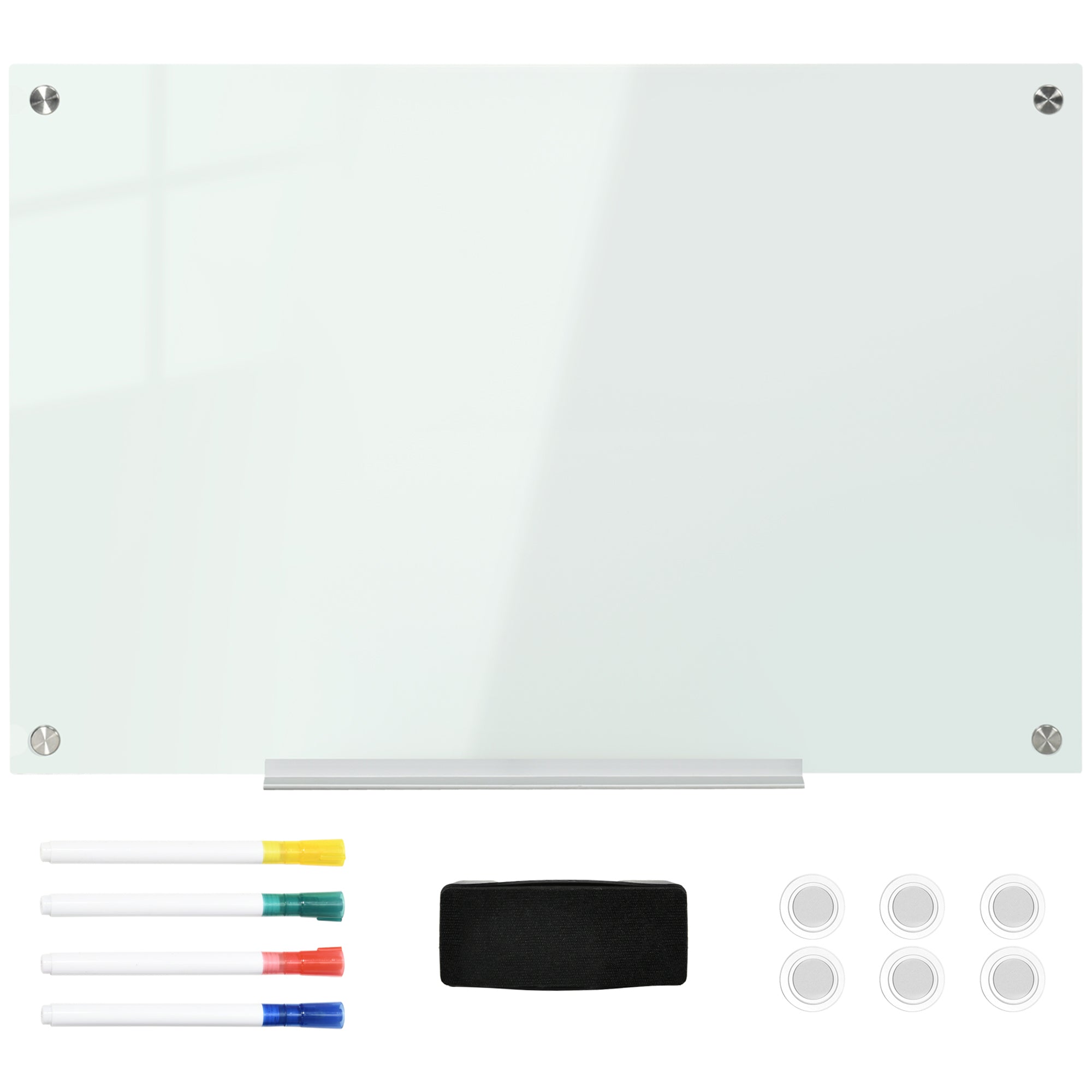 Vinsetto Valkoinen Magneettinen Taulu 4 Kynällä, 6 Magneetilla, 1 Sienellä, 1 Hyllyllä, Easel Lasi Paneeli Seinälle Asennettavaksi Helppo Pyyhkiä 90 x 60 cm