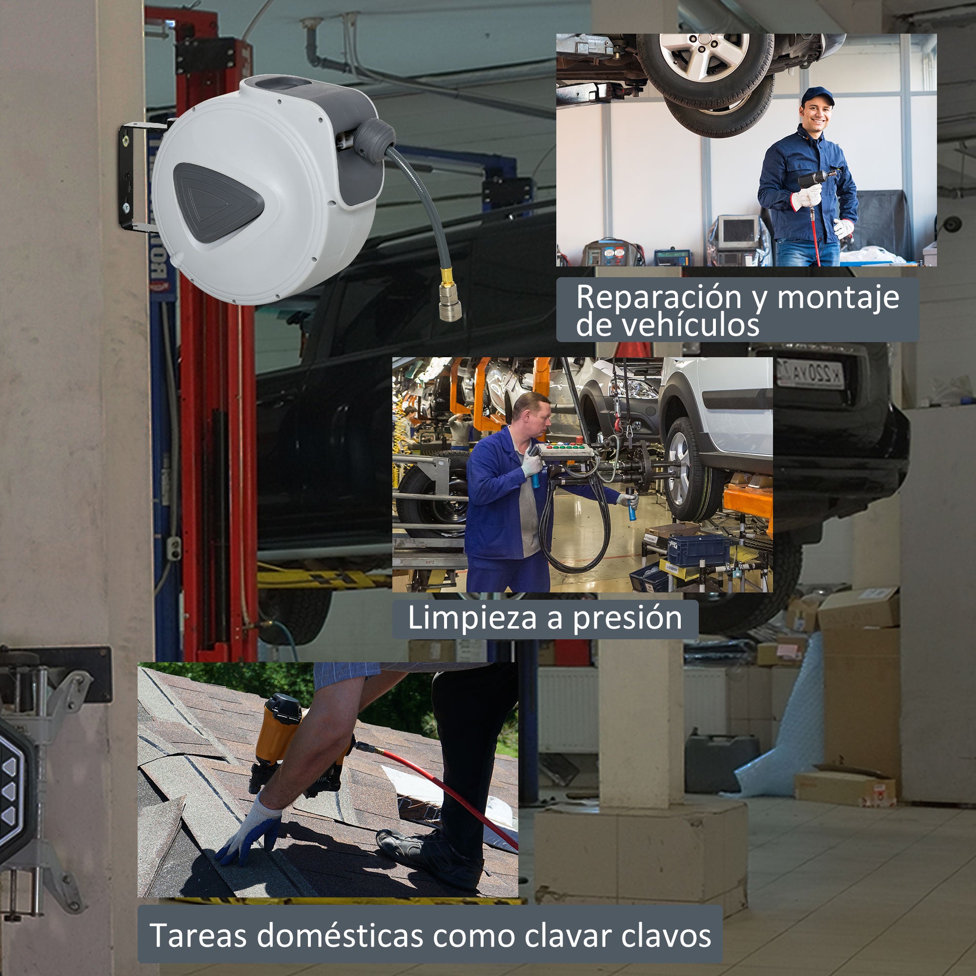 - - TAKAISINVETÄVÄ: Tämä paineilmaputkiviennin on varustettu automaattisella takaisinvetolla, joka tallentaa letkun nopeasti ja helposti. Vetämällä samaa letkua voit lukita sen haluttuun pituuteen