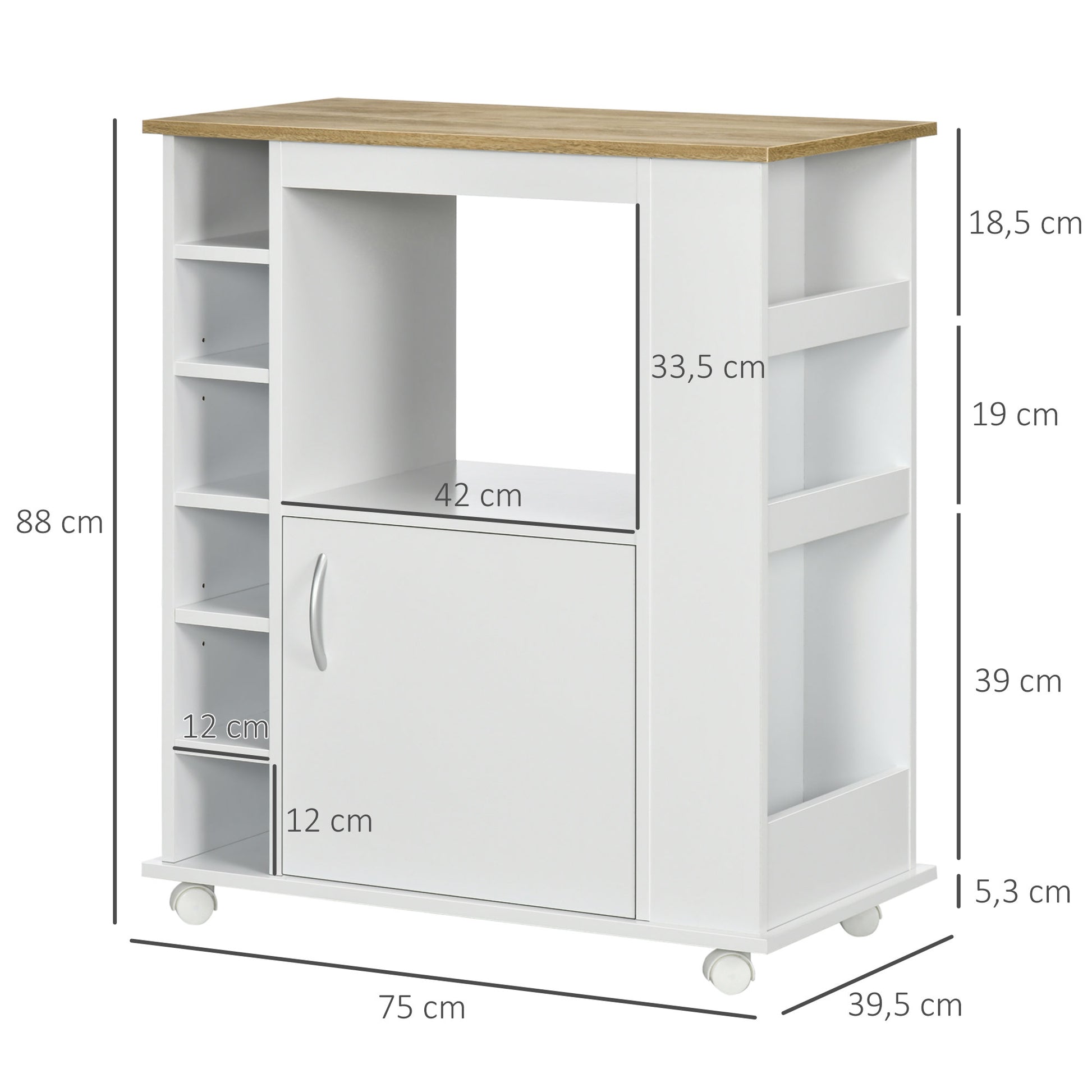 HOMCOM Keittiön Kaappi Rollaattorilla, Buffet-ruokakaappi Oveilla ja Säilytysosioilla, Mikroaaltouunille, Moderni tyyli 75x39.5x88 cm Valkoinen