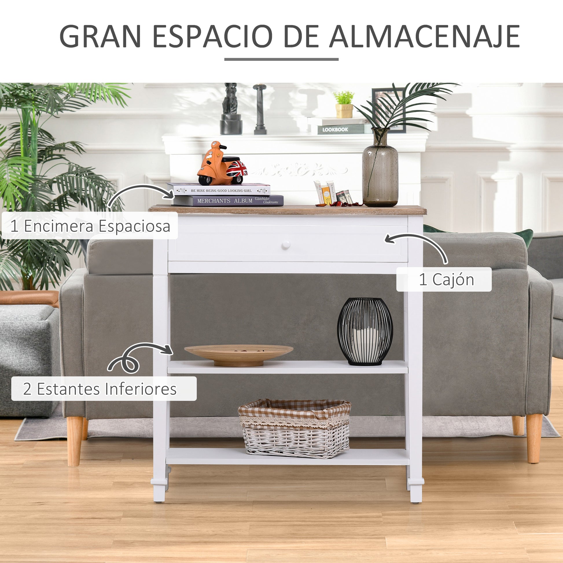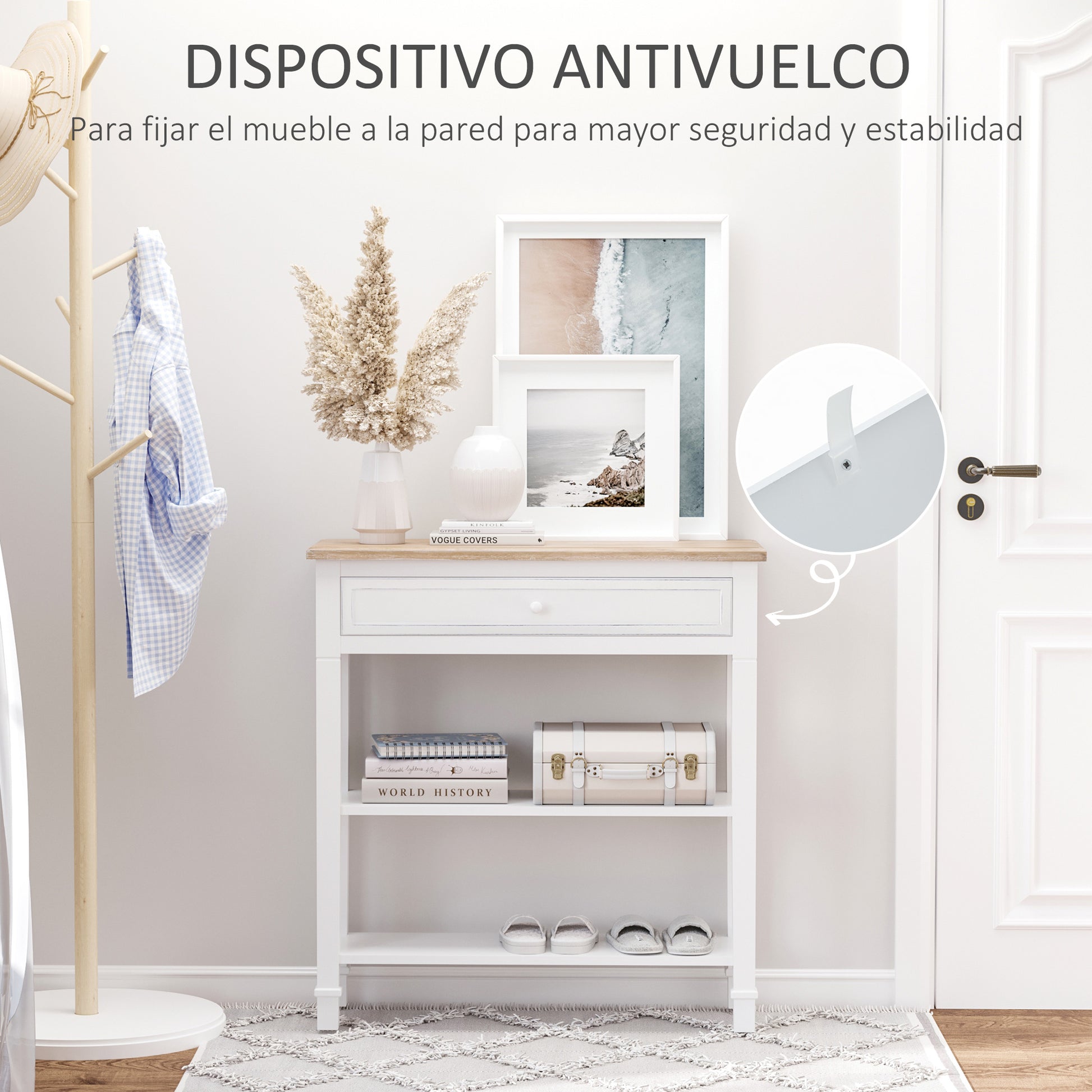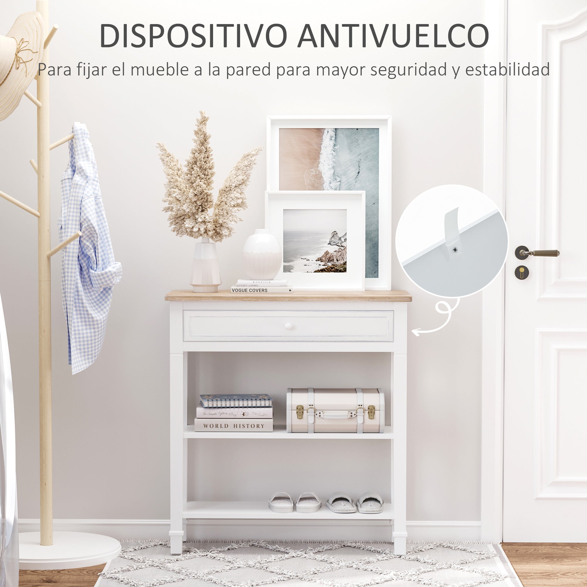 - - RETRO- JA KORISTEELLINEN MUOTOILU APLIIKKAALLE: Tässä eteiskonsolissa on retrotyylinen muotoilu, joka on ihanteellinen kodin sisäänkäynnin koristelemiseen. Työtason lisäksi siinä on kaksi ylimääräistä hyllyä, jotka ovat täydellisiä kenkiä ja asusteita varten. Näin ollen sinulla on aina tietty paikka säilyttää kenkiä, laukkuja ja muita esineitä tullessasi kotiin.
