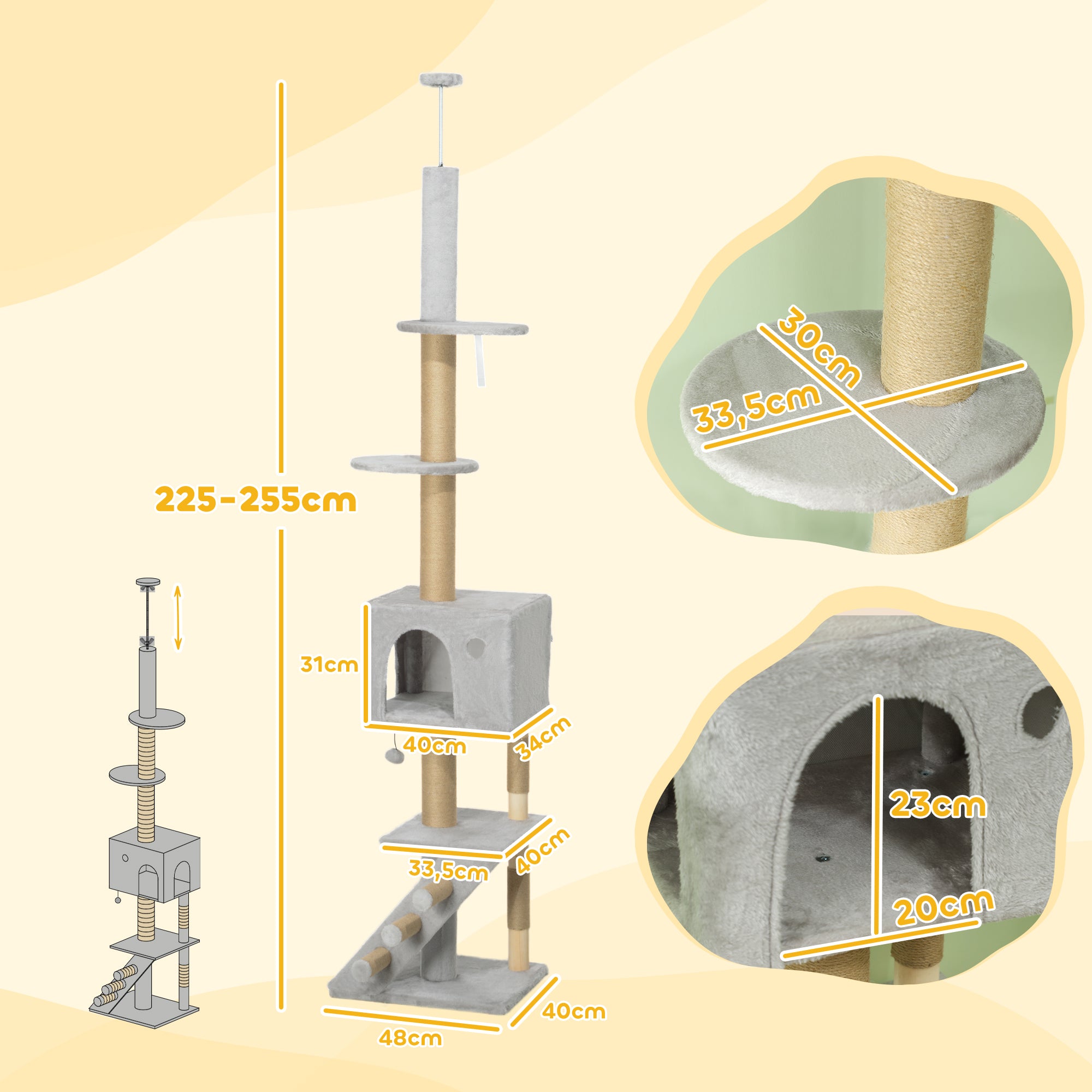 PawHut Katto-Maahan Kissapuu 225-265 cm Säädettävä Korkeus Kissan Raapimapuu Useilla Alustoilla Portaat Roikkuva Pallo Vaaleanharmaa