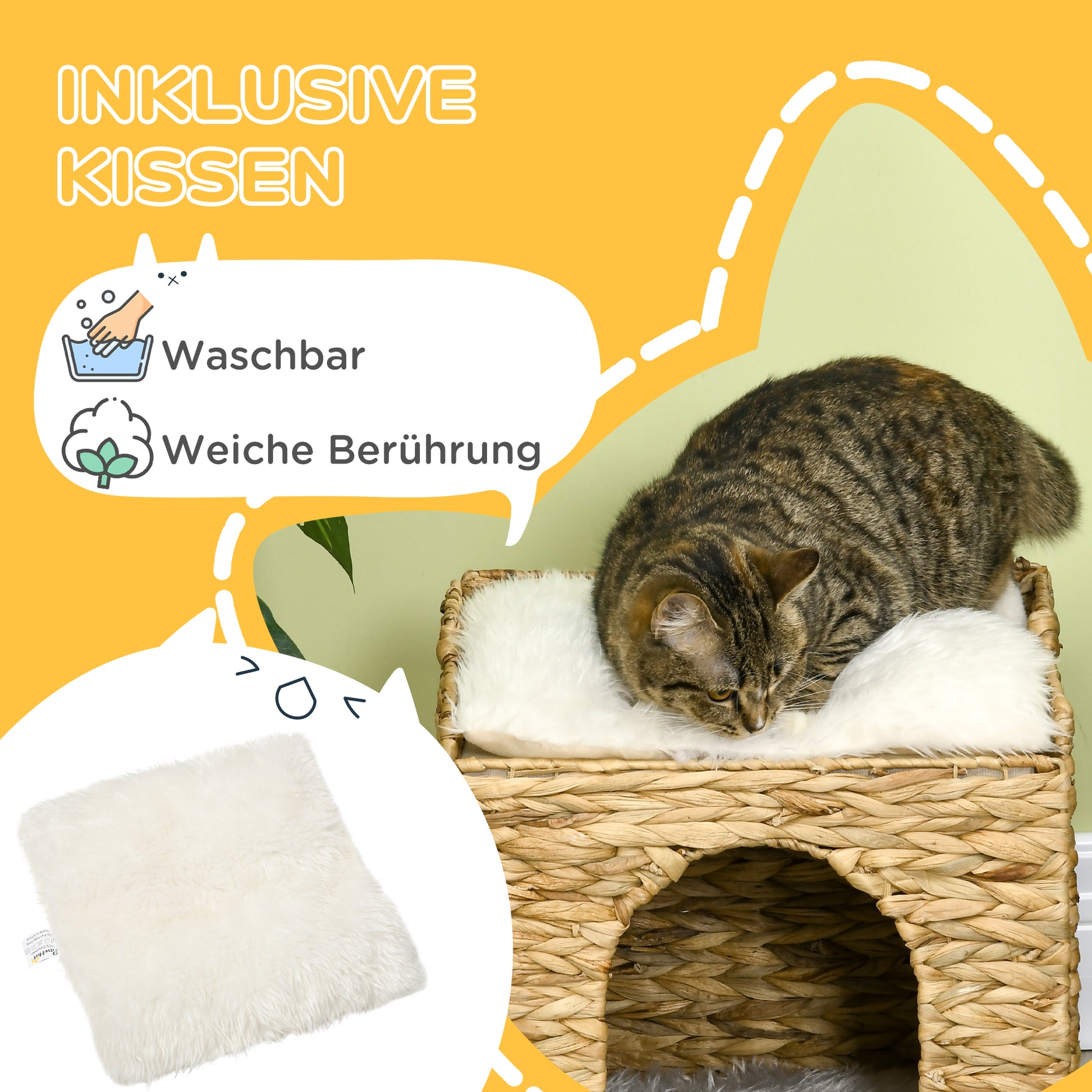 PawHut Rottinkikissatalli, Kissaluola Pehmusteella, Kahdella Tasolla, Kissansänky, Kissan kori enintään 5 kg:lle, Vesihyasintti, 37,5 x 37,5 x 41,5 cm, Ruskea