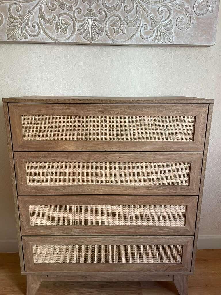 - - STYLE CANNAGE : Cette commode allie design moderne et ambiance bohème. Élégante et fonctionnelle, elle s'intègre dans n'importe quel espace. Sa base surélevée facilite le nettoyage et protège vos objets de l'humidité.