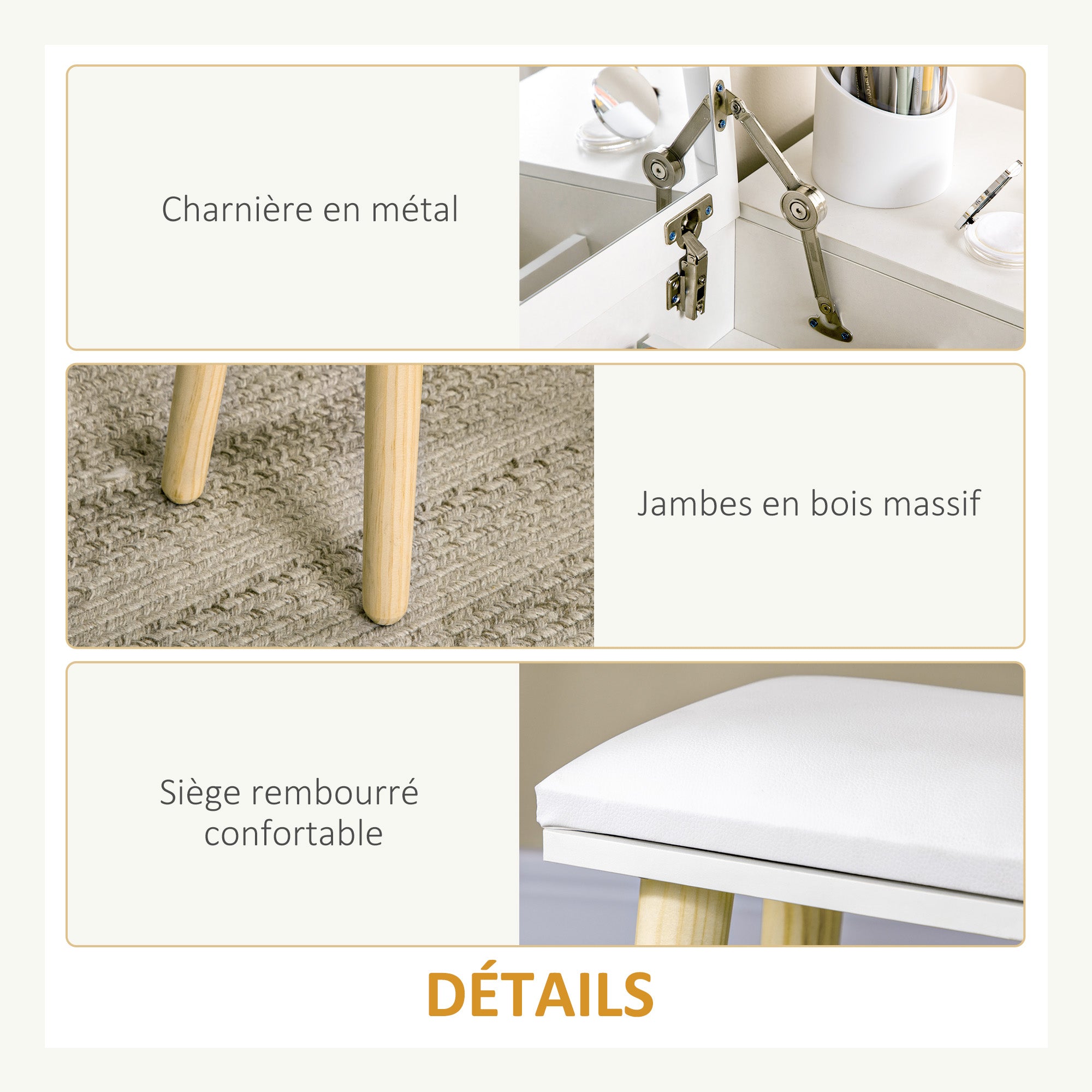 Table de Maquillage HOMCOM avec Miroir Pliant et Tiroirs en MDF Bois de Pin Massif Blanc