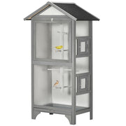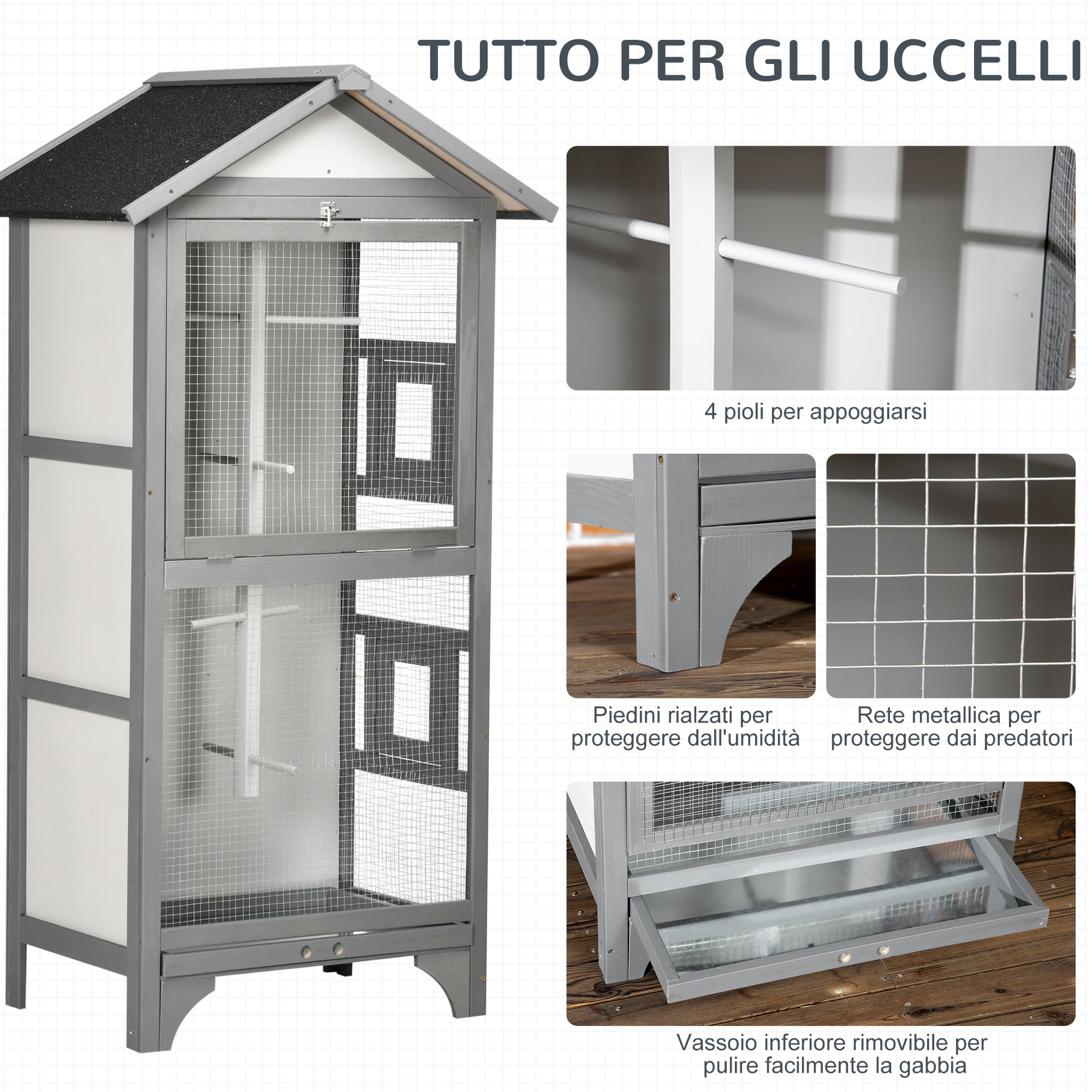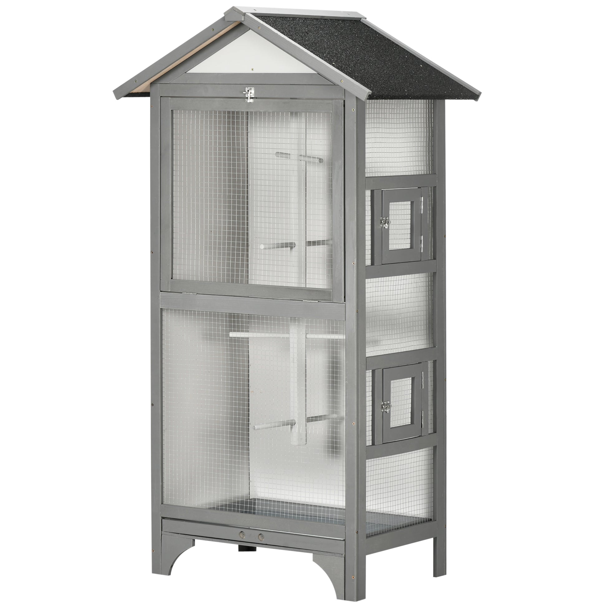 Aviary Extérieur PawHut en Bois de Sapin Gris Clair, 3 Ouvertures avec Serrure, 4 Perchoirs et Bac Amovible, 80,5x57x153cm