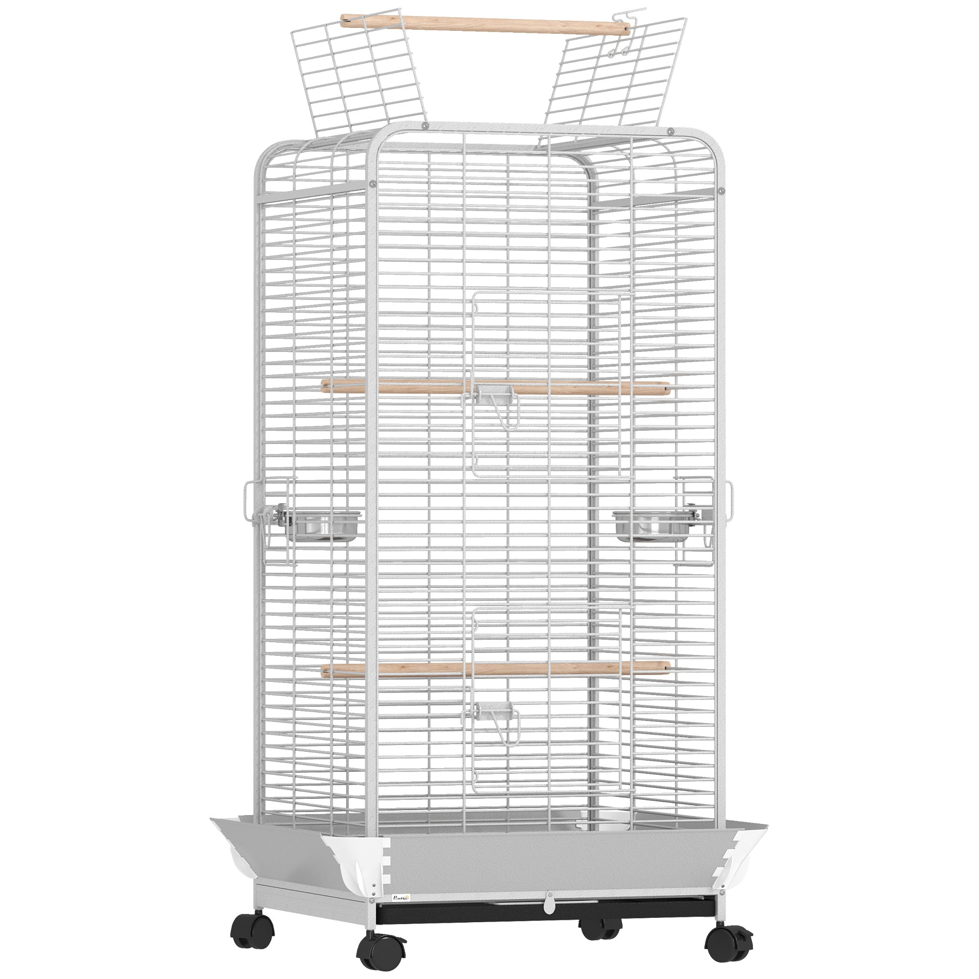 Cage à Oiseaux PawHut pour Perroquets avec Roues, Perchoirs, Nourrisseurs et Plateau Amovible - 79x73x146 cm - Gris Clair