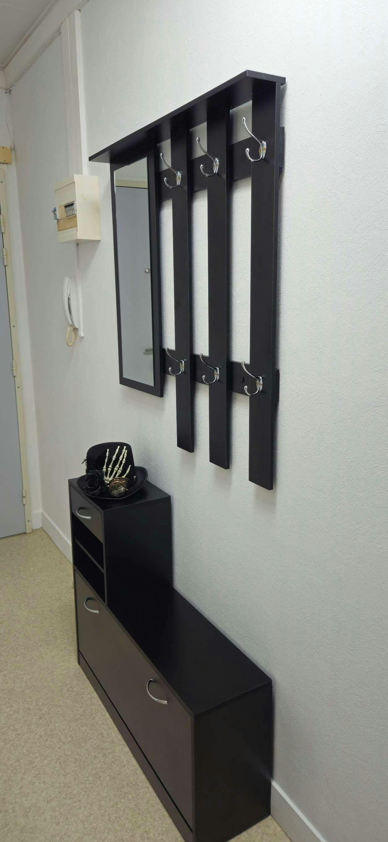 - - SPÉCIFICATIONS : Dimensions du porte-manteau : 90L x 10P x 102H cm, dimensions du miroir : 25L x 70H cm, dimensions du cabinet à chaussures : 90L x 24P x 75H cm, charges maximales recommandées : 10 Kg (porte-manteau) / 30 Kg (cabinet à chaussures).