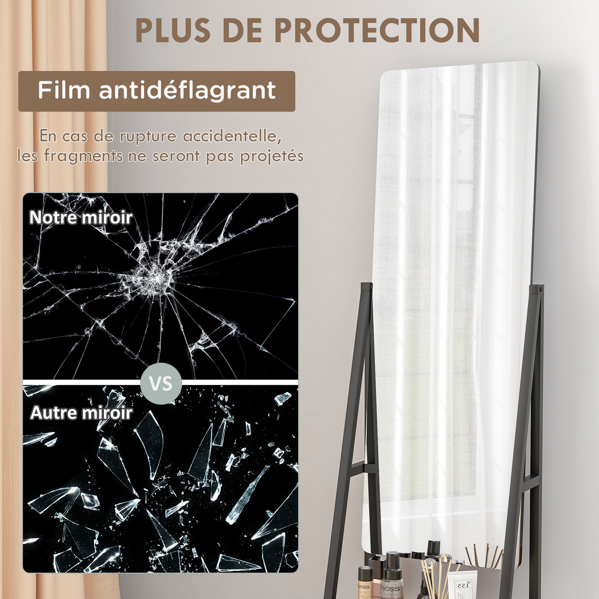 HOMCOM Pravokutno Stojeće Ogledalo Puni Visina na Kotačima s Podešavanjem Kuta i 2 Police - dim. 42L x 37W x 155H cm - crna i rustikalna smeđa