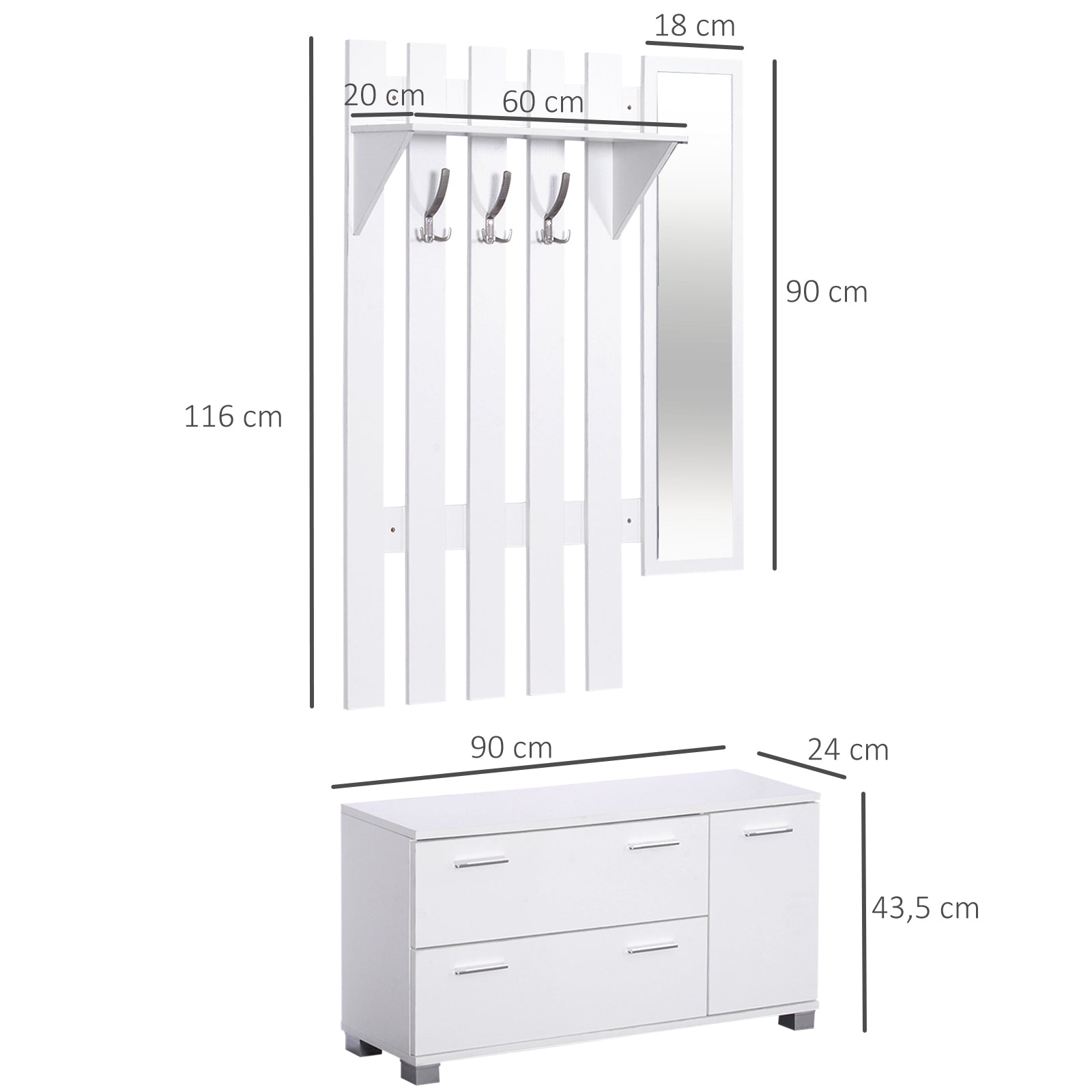 - - UKUPNE DIMENZIJE: 90x21.5x116 cm (ŠxDxV). Veličina ogledala: 18x90 cm (ŠxV). Dimenzije ormarića za cipele: 90x24x43.5 cm (ŠxDxV). Svaka kuka podnosi maksimalnu težinu od 3 kg. Ormarić za cipele podnosi maksimalnu težinu od 100 kg