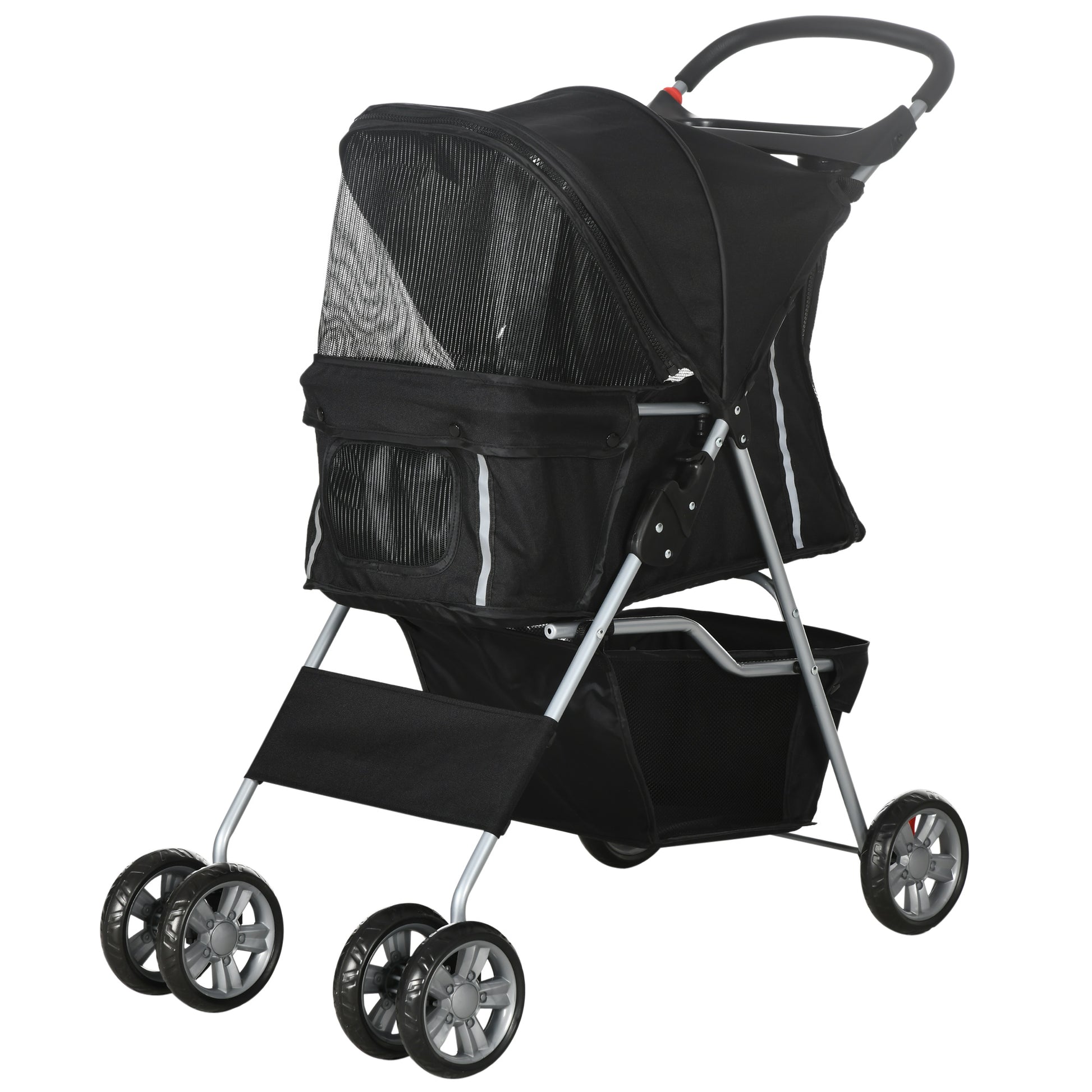 PawHut Kolica za Kućne Ljubimce Sklopiva Kolica za Male Pse s Podesivim Krovom, Mrežastim Prozorima i Držačima za Čaše, Kapacitet 15 kg, 75x45x97 cm Crna