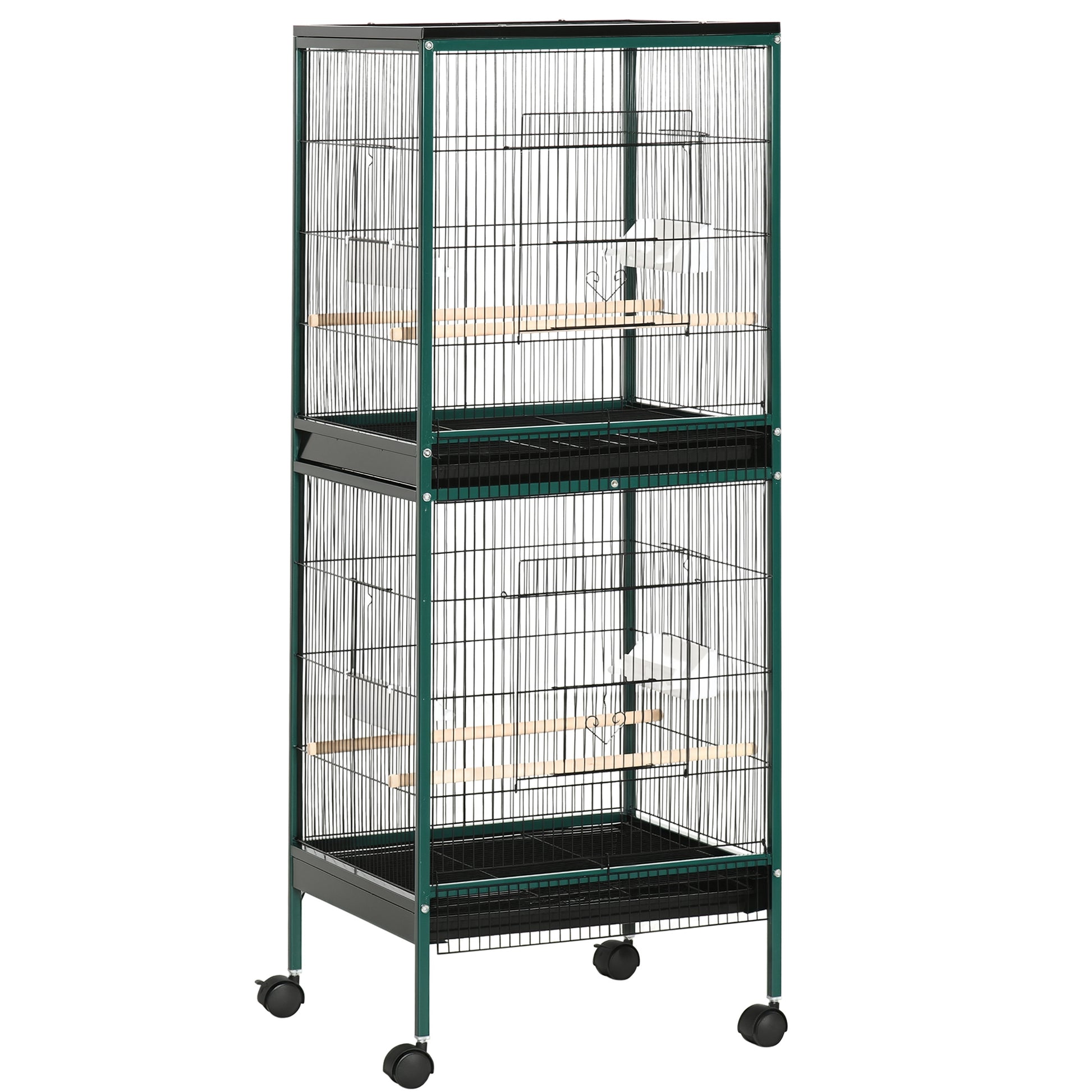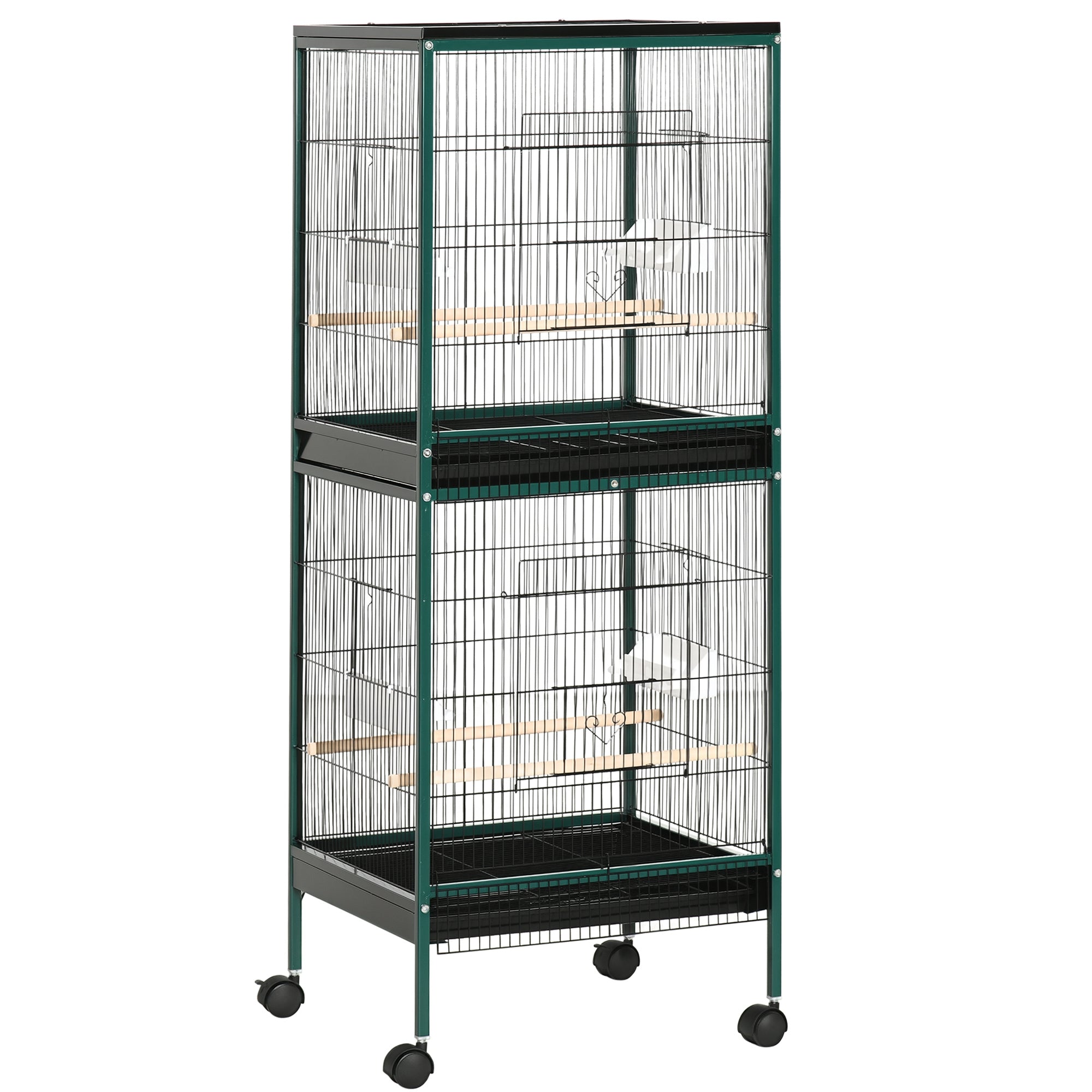 PawHut Velika Kavez za Ptice na Stajnom Postolju - Dvostruka Avijarija s hranilicama, stalcima i uklonjivim poslužavnikom - Kotači - 51.5 x 50 x 140 cm Zelena Crna