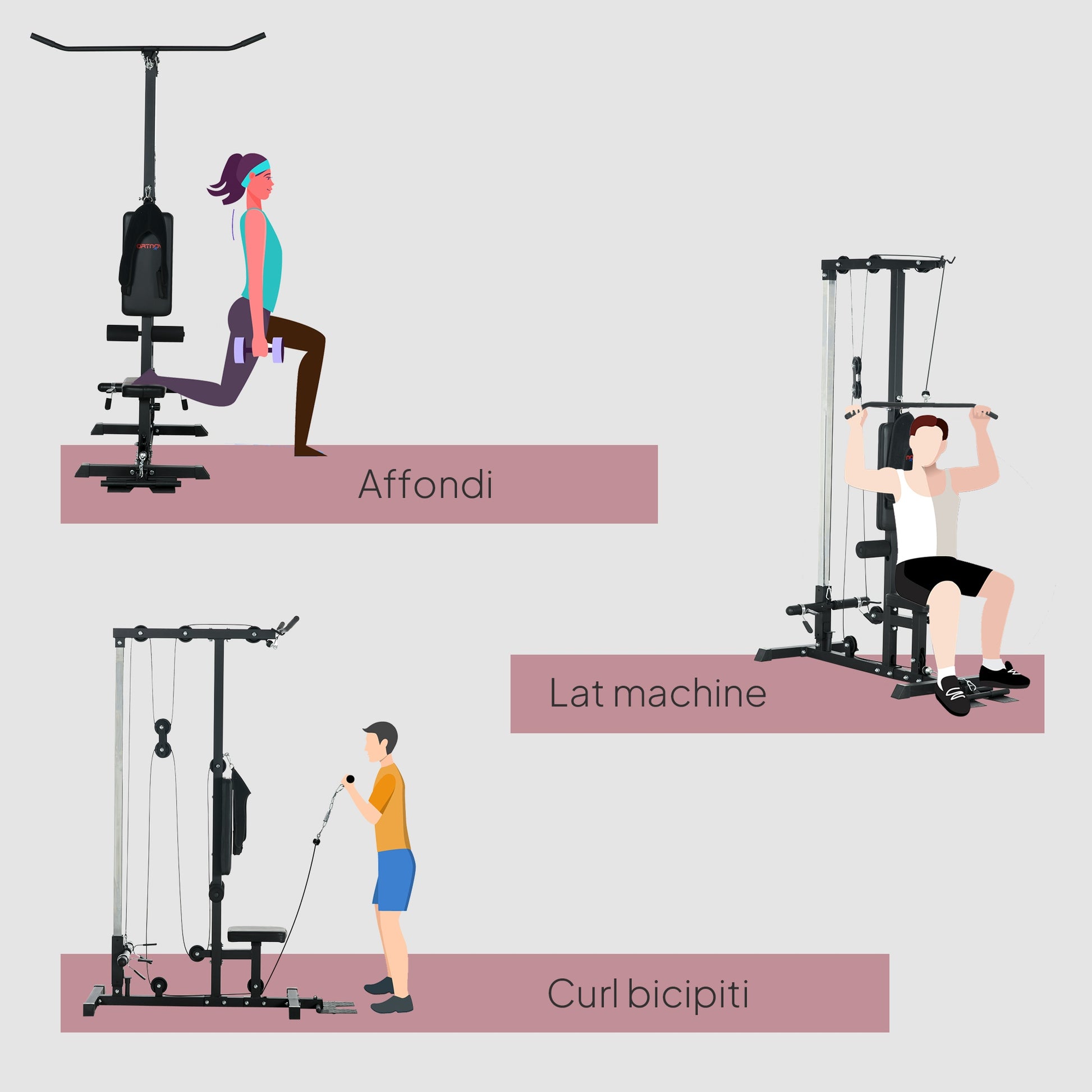 SPORTNOW Višenamjenska Fitness Stanica, Power Tower s Lat Mašinom, Sjedalo s Podesivom Visinom, Leđna Ekstenzija i Podrška za Težine, 140x108x197 cm, Crna