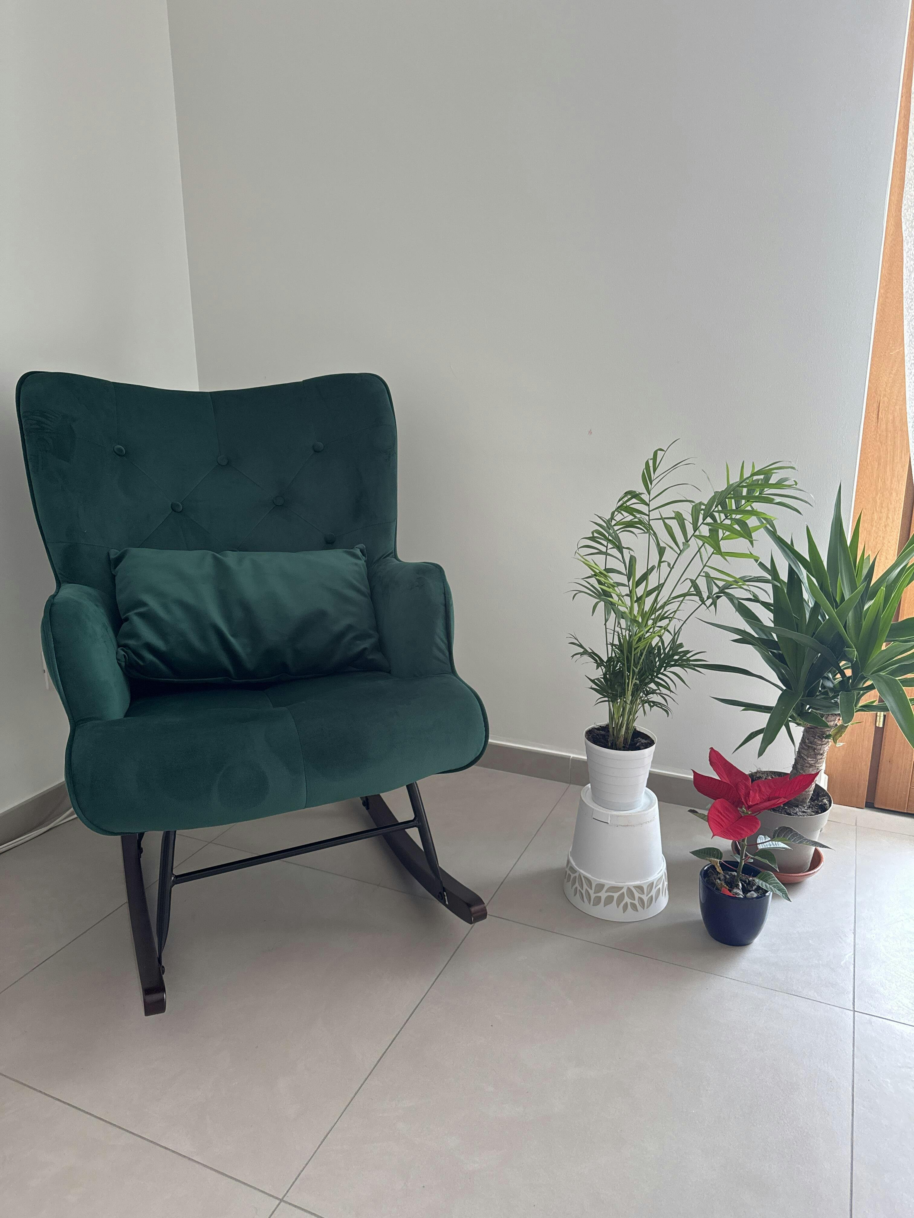 - - KÉNYELMES: Ringató székünk elegáns bársony burkolattal rendelkezik, habbal párnázott, ergonomikus háttámlával és karfákkal. A kiegészítő párna extra kényelmet biztosít