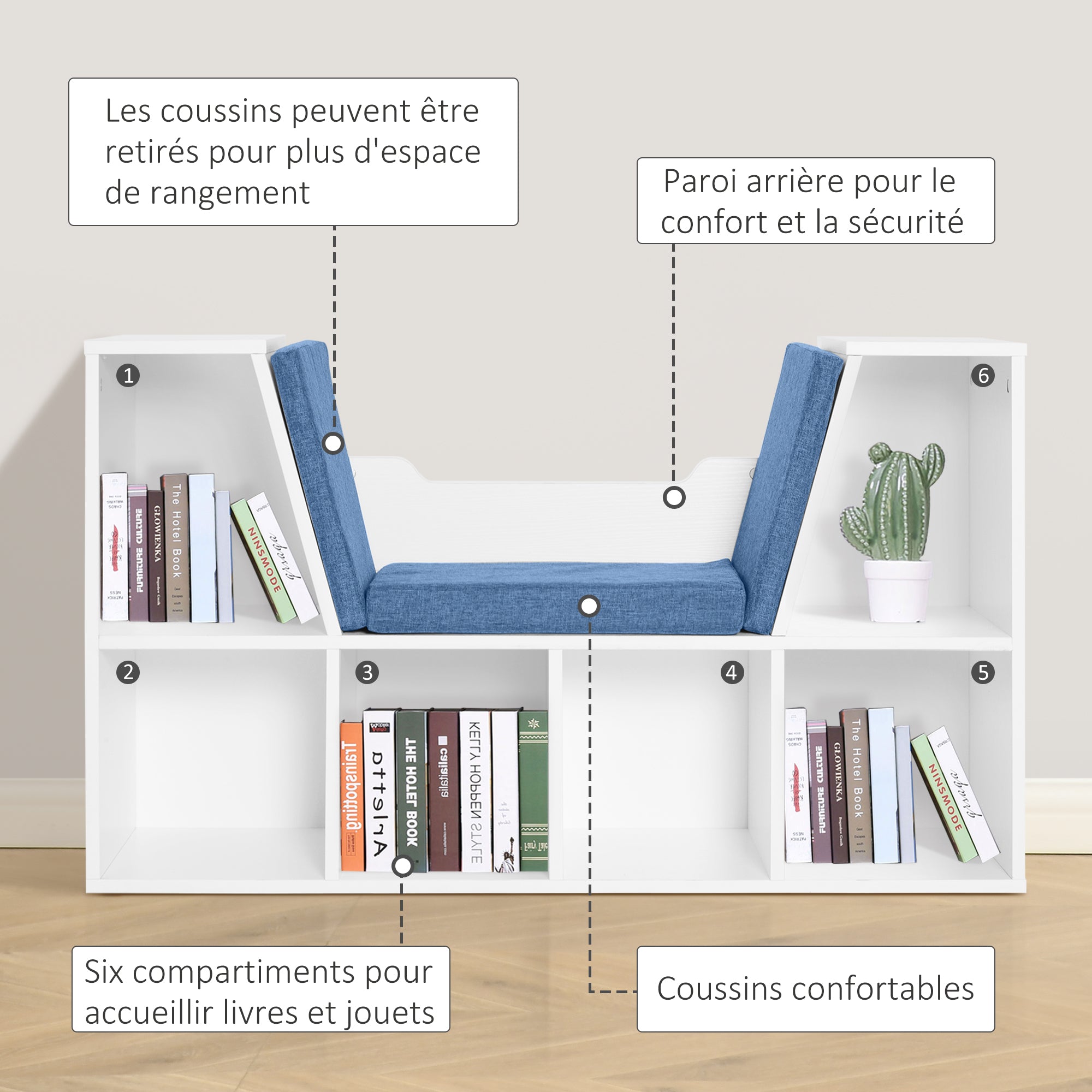 HOMCOM 2 az 1-ben Könyvespolc Pad, Modern Dizájn, 6 Rekesz, 3 Párna, 102L x 30W x 61H cm, Fehér-Kék