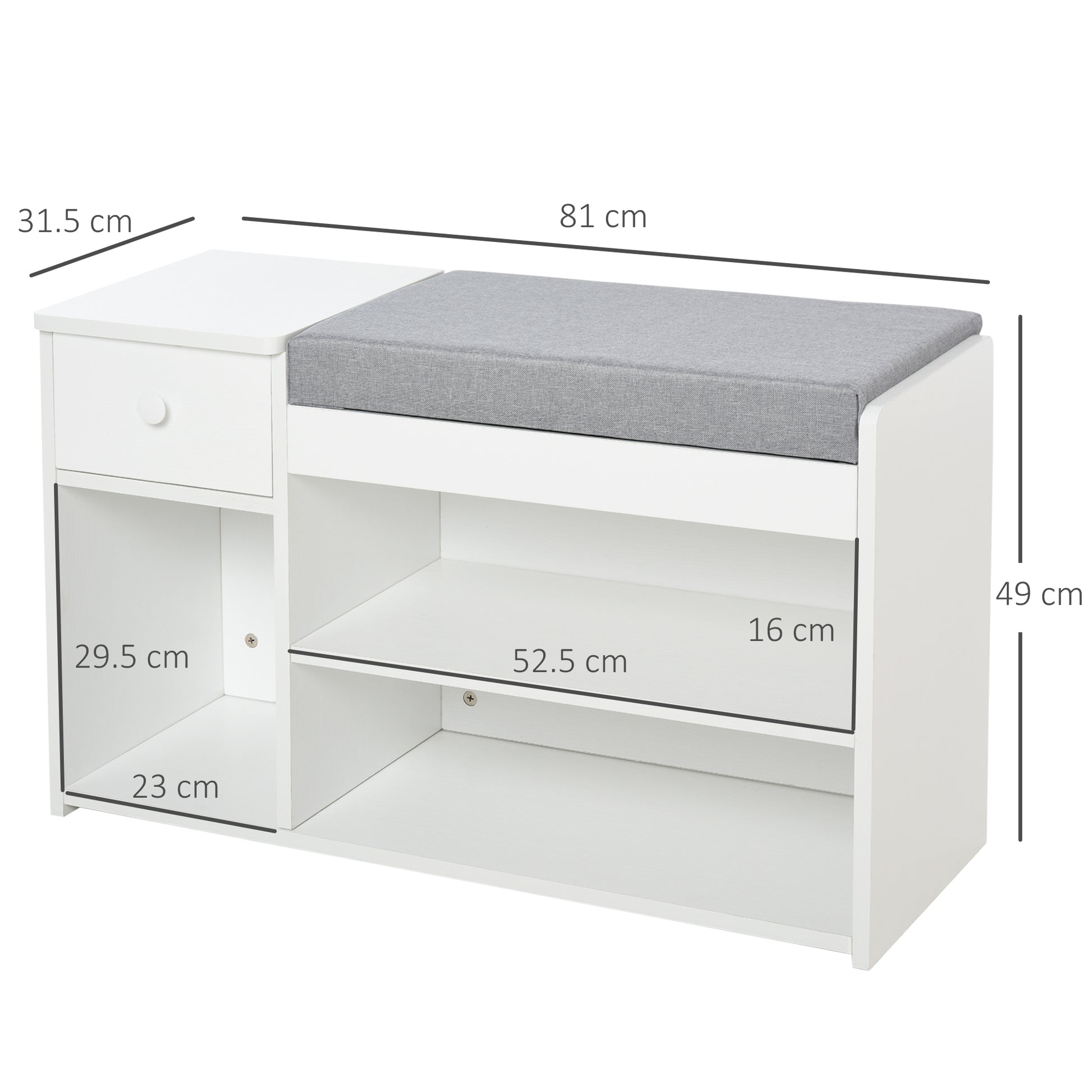 HOMCOM Cipőpad, Párnával, Fiókkal és 3 Nyitott Térrel, Fából Készült Előszobai Bútor 81x31,5x49cm, Fehér