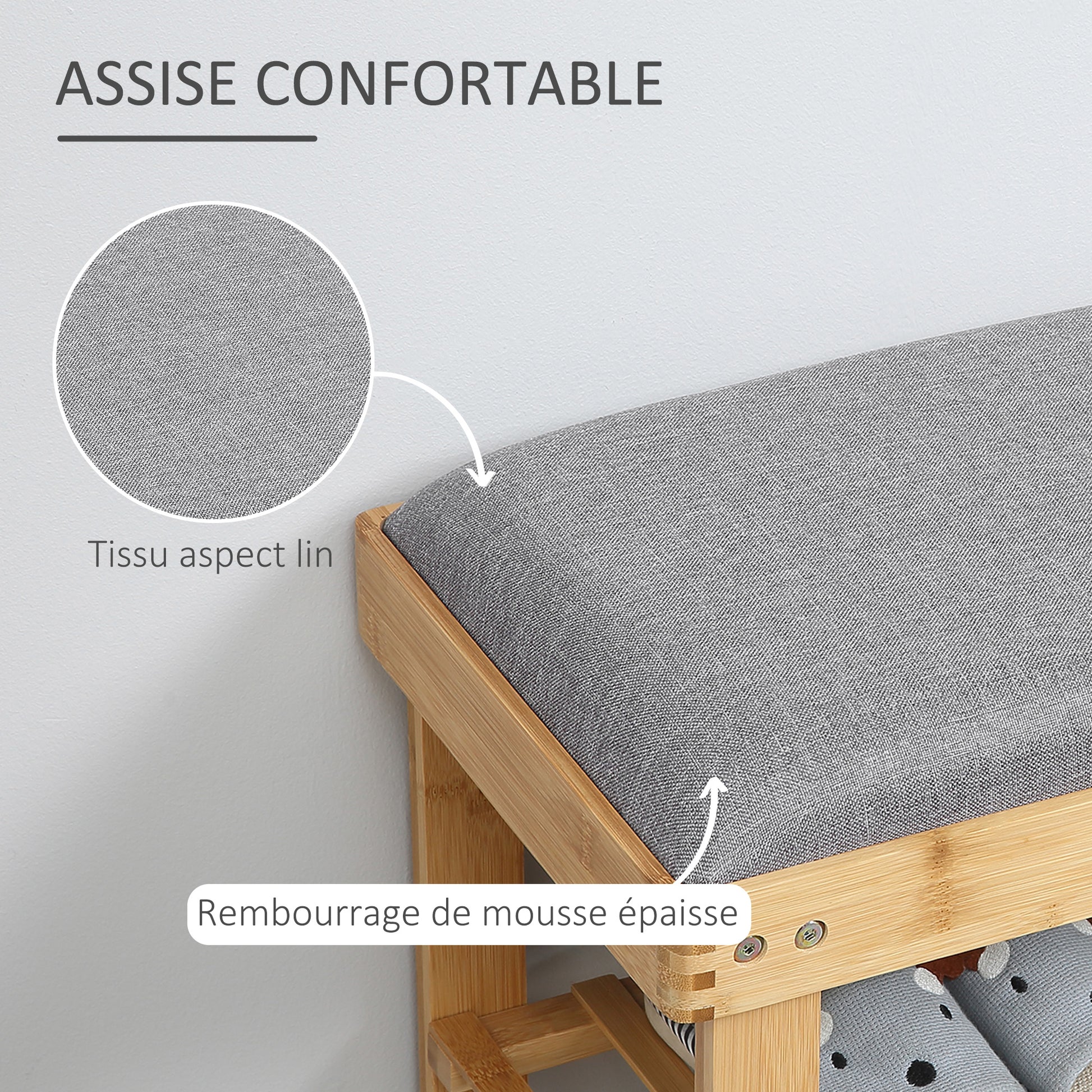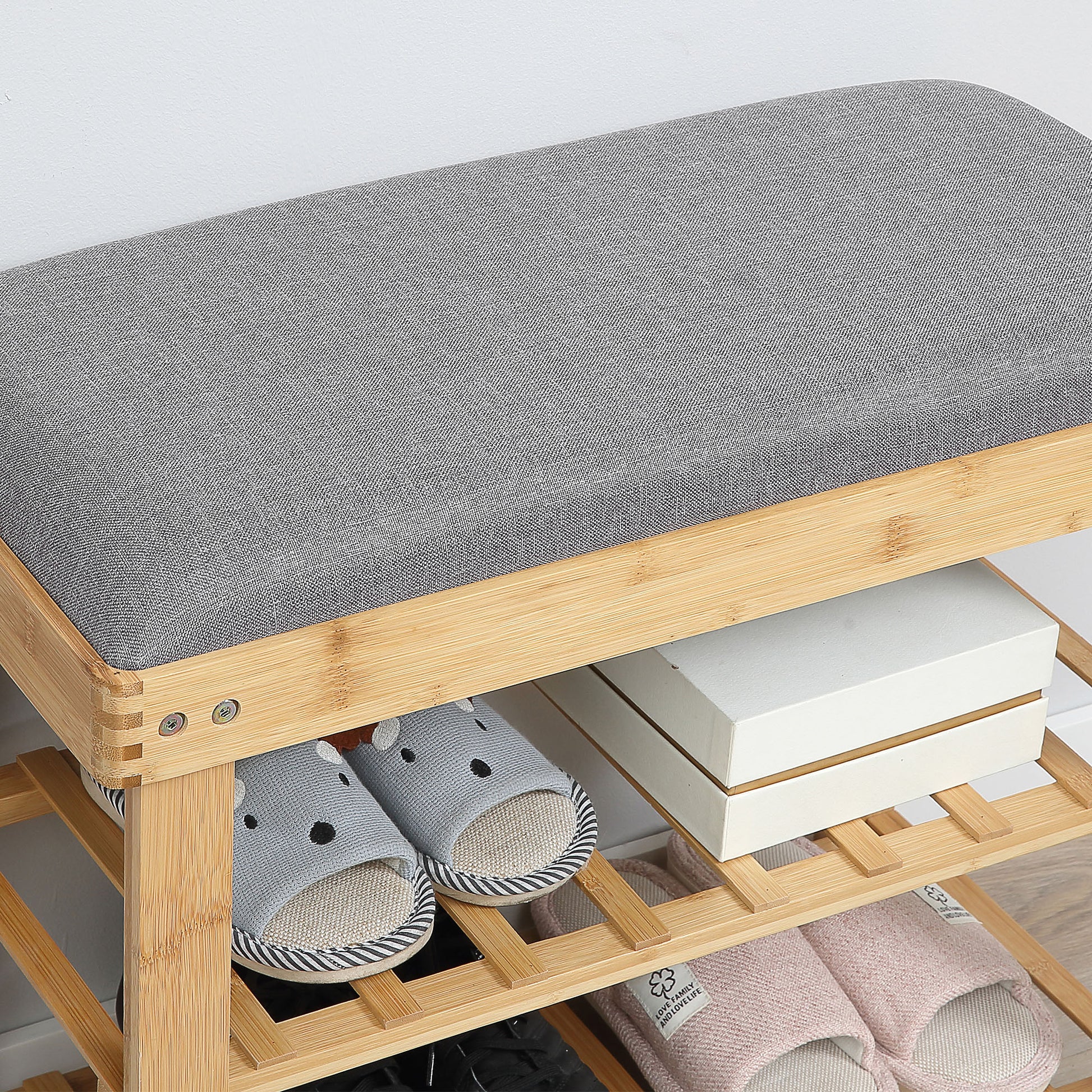 HOMCOM Cipőszekrény Pad Cipőtároló 2 Polccal Szürke Párnával Bambuszban