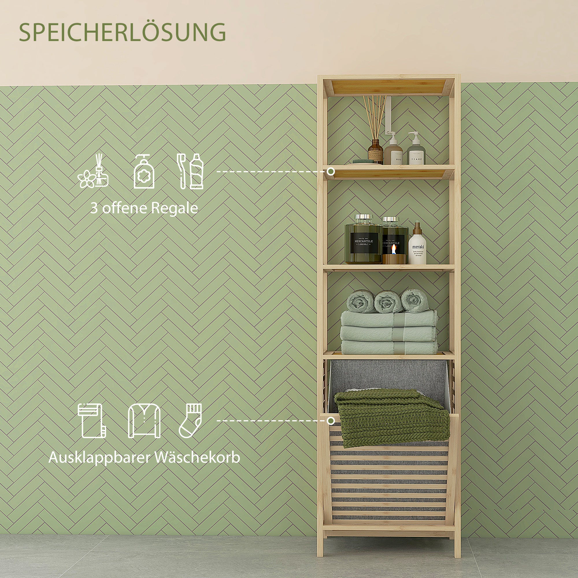 - - Sokoldalú tárolási megoldás: Ez a magas fürdőszobai polc 3 nyitott polccal és egy egyedi dőlésszabályzós mosógyűjtővel rendelkezik textil béléssel, funkció és stílus kombinálva az Ön fürdőszobai tárolásához.